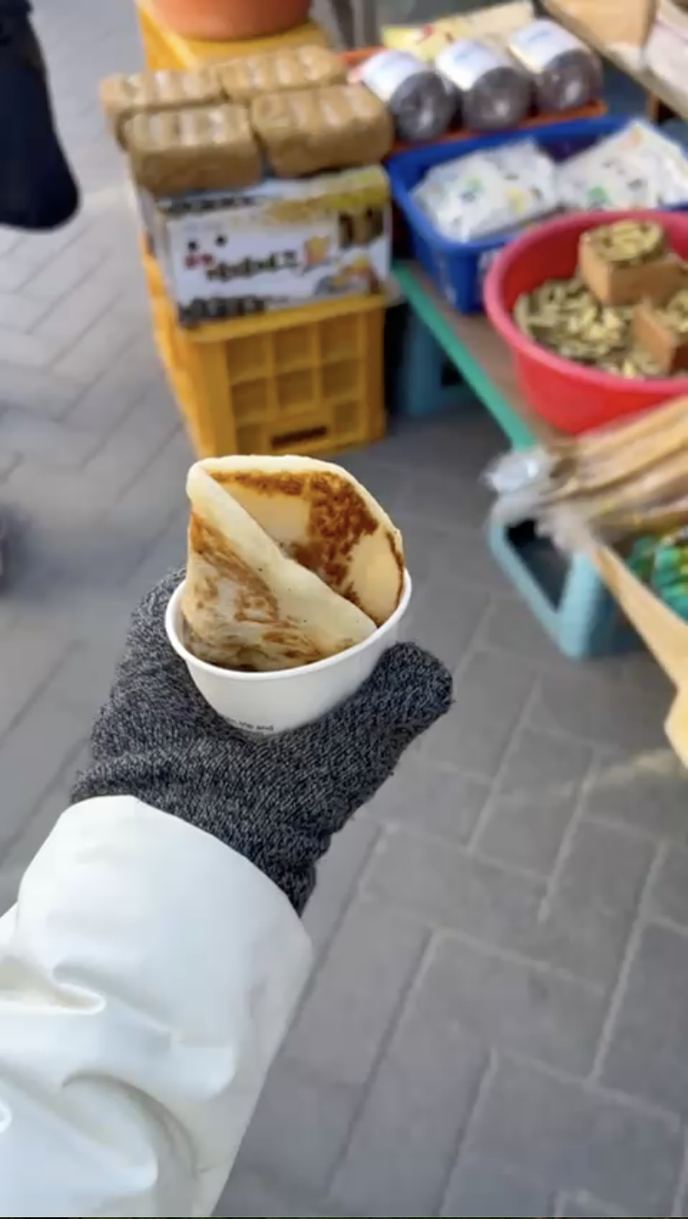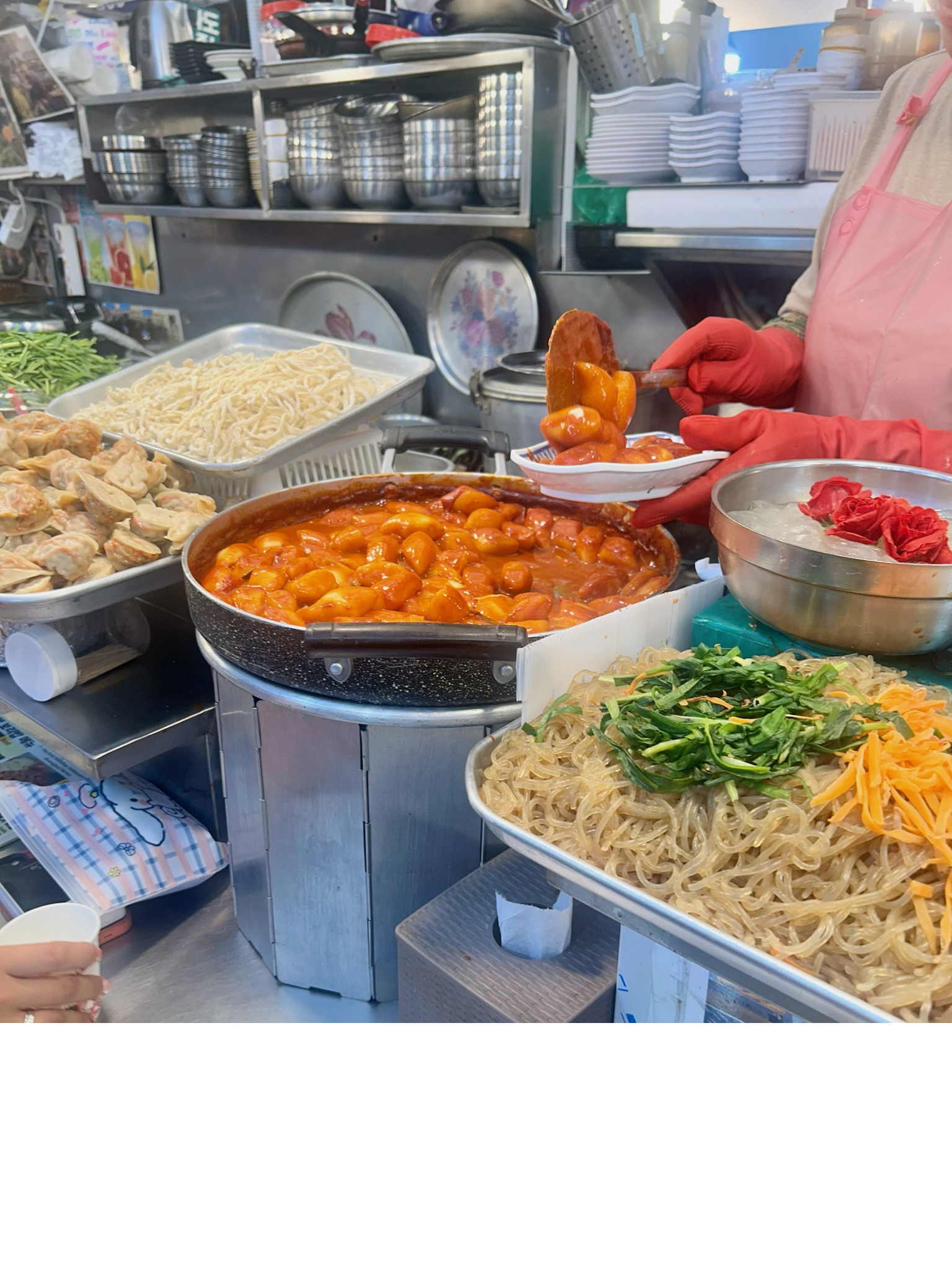 Korean street food has a large variety of options, so it can be hard to choose what to try at the market! I tried some hotteok, which is a sweet, chewy pancake stuffed with brown sugar, cinnamon and nuts. Hotteok is a popular street food snack in the wintertime, since it is warm and sweet. I also had to try some tteokbokki from one of the food stalls because of the amazing smell that wafted through the air as I walked by. It’s a chewy rice cake dish covered in a spicy, slightly sweet sauce. Both of these foods were delicious!