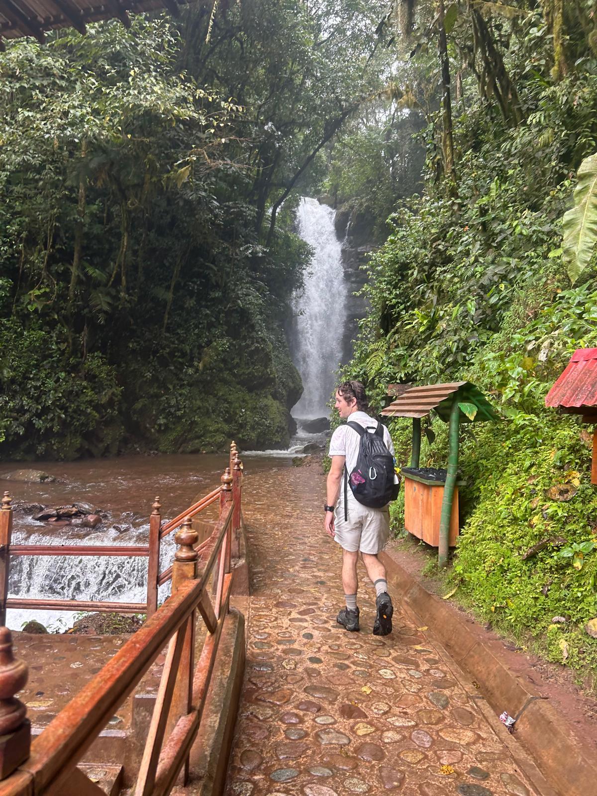 I took about an hour and we got a ride from someone going up the road about halfway through. The path was full of the tropical plants and flowers and more butterflies than I have ever seen in my life. Once we got there, we got to go swimming in the water and explore some of the rocks underneath it.
