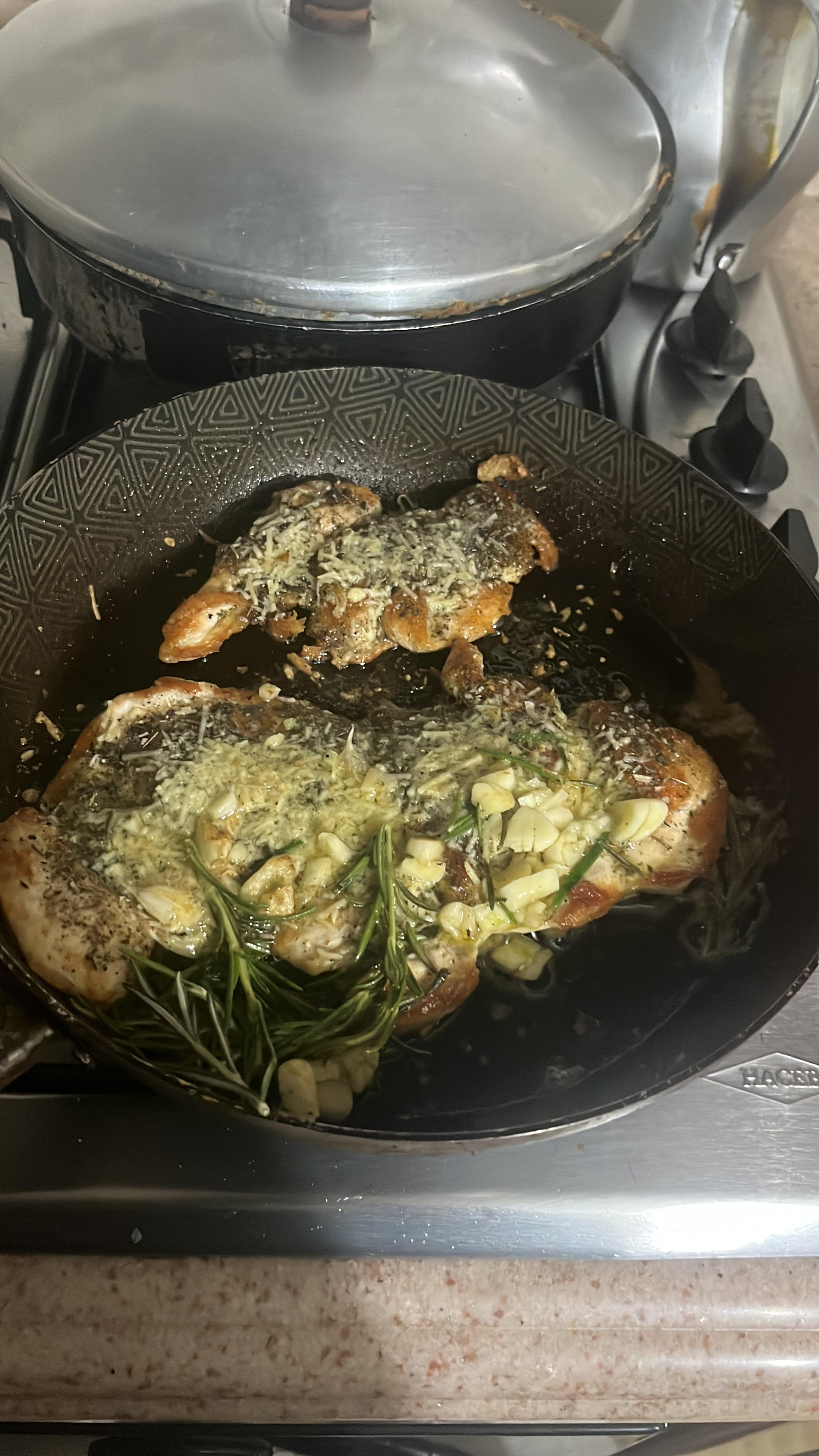 Tengo mucha suerte que vivo en un apartamento solo porque hay voluntarios que viven con familias anfitrionas entonces casi siempre cocino para mí mismo. También tengo mucha suerte de que tengo mucha accesibilidad a comida saludable. Tengo una carnicería en mi pueblo y toda la carne viene directamente de granjas en mi pueblo. Mi cosa favorita que cociné esta semana fue el pollo de romero. Frito el pollo en aceite de oliva y añado sal, pimienta negra, mantequilla, ajo y romero al sartén.