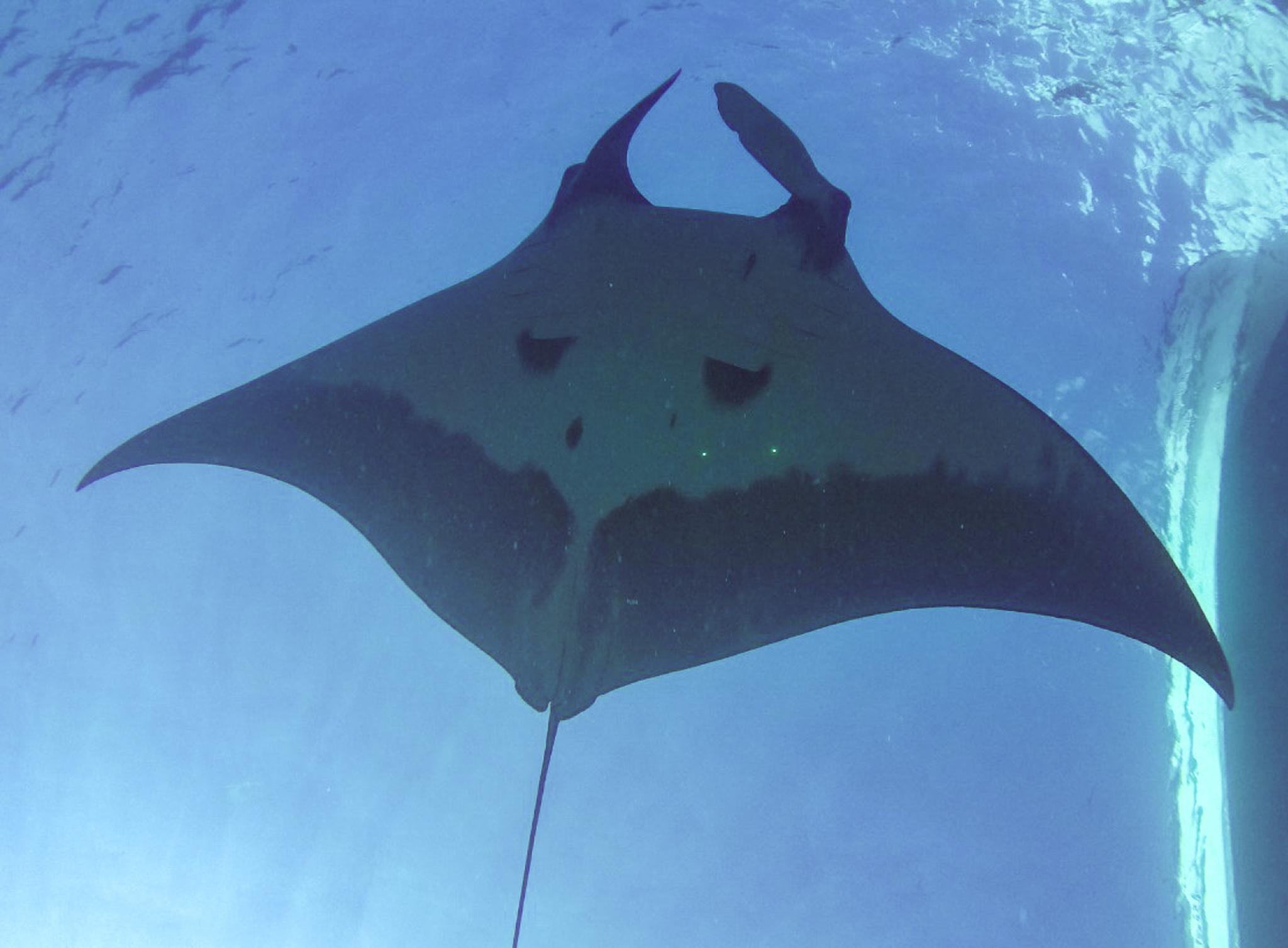 Besides tagging methodology, we are using mark-recapture. This name is misleading, because it doesn’t involve "marking" or capturing any animals. All of the marking and recapturing is done using photography. By accumulating these many images over time, we can see how the mantas are growing, if they are getting injured, which ones are returning, and which ones might be pregnant. When we are using mark recapture, we use a two-laser system to project two dots onto the mantas.