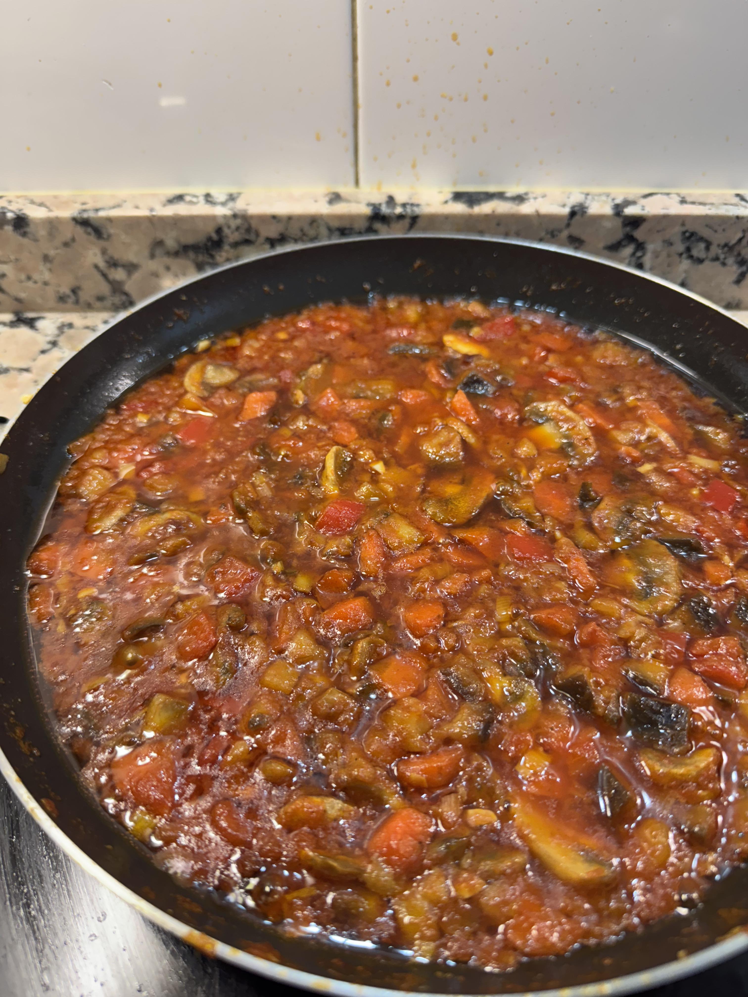 I learned about Spain's Sunday family lunch tradition. María (la madre de Ana) cooked Pisto, a delicious vegetable dish, colloquially referred to as "Spanish ratatouille." The stew traditionally includes tomates, cebollas, pimientas, calabacín, y berenjena (eggplant). María's version also had setas (mushrooms).