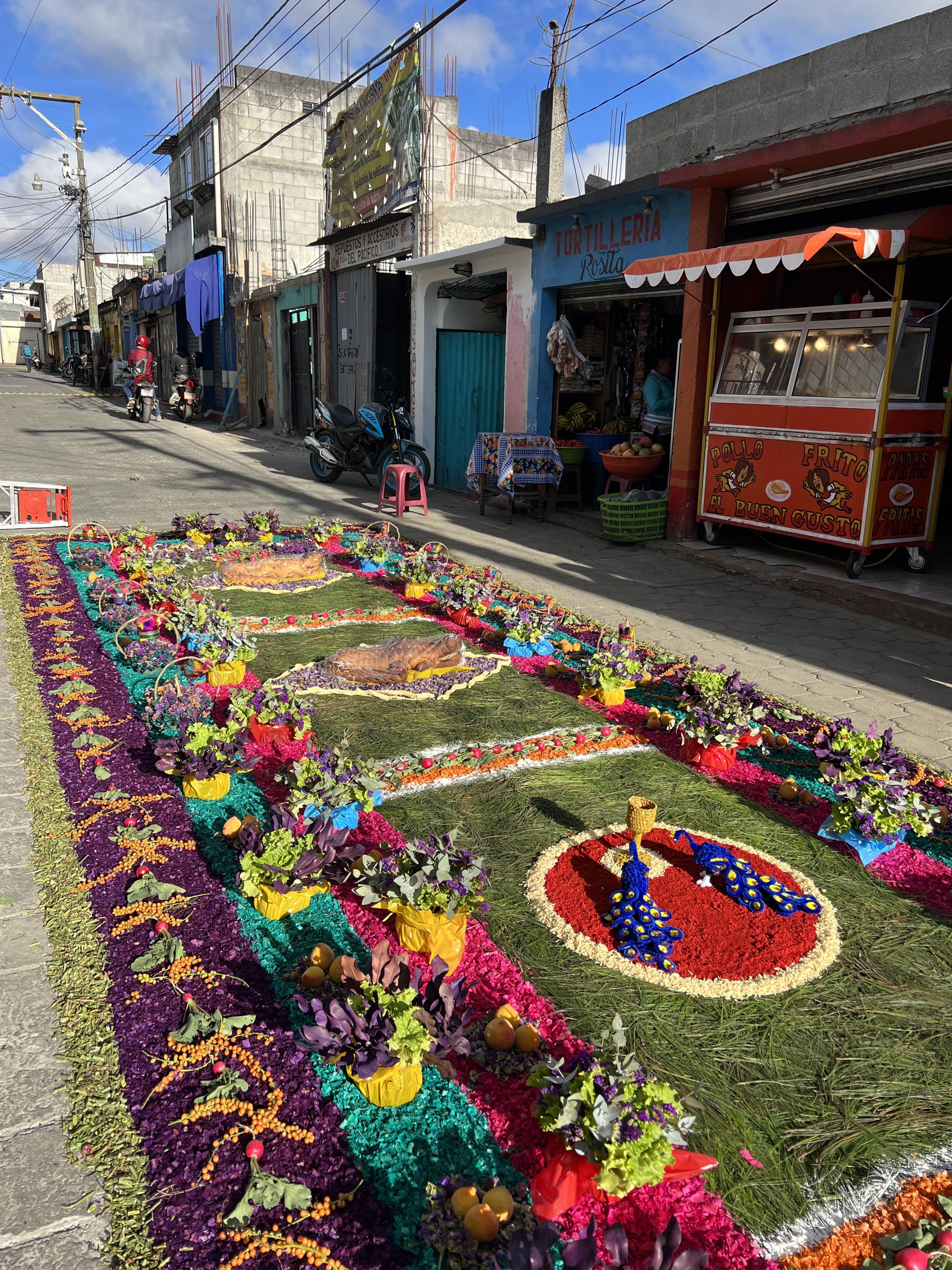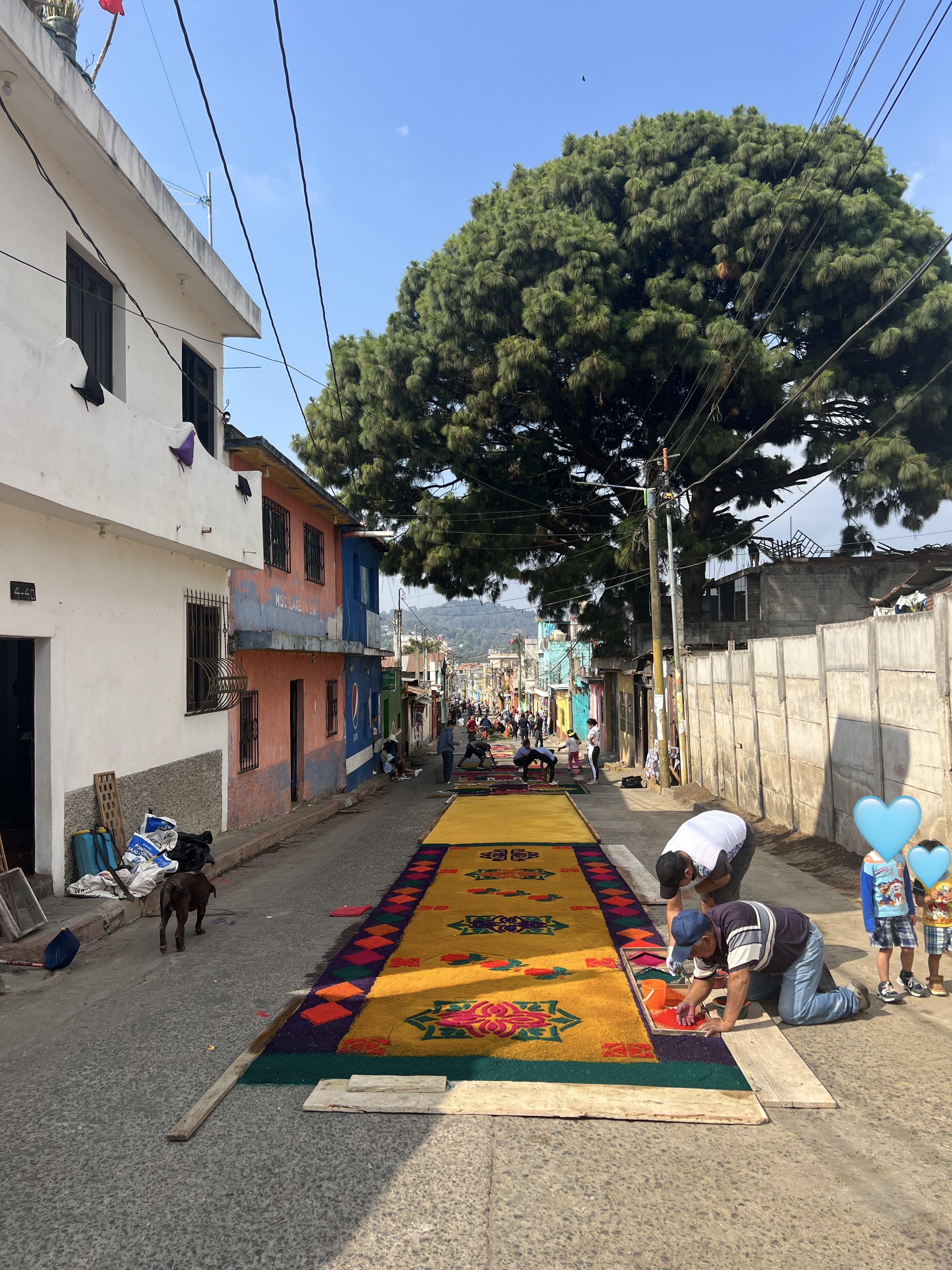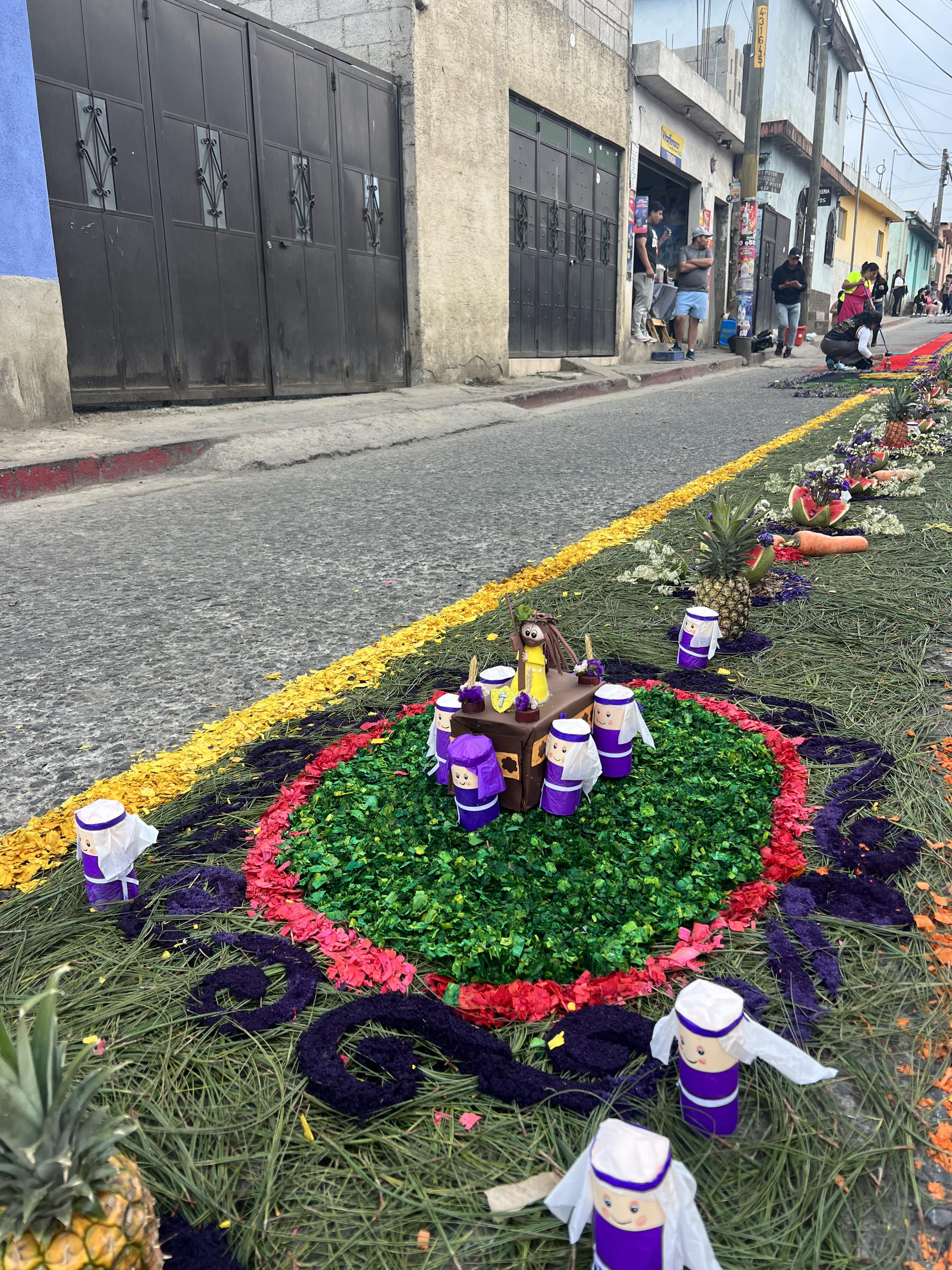 In Guatemala, Semana Santa, Holy Week, is a big deal. Families and neighbors will stay up through the night making alfombras, carpets, out of flowers, sawdust, and other materials during this week. The processions will later pass over these alfombras. These alfombras often depict holy imagery. People travel from all around the world to watch these processions, with Antigua specifically attracting thousands of tourists. Giant platforms featuring biblical figures and scenes, such as Jesus on the cross, are carried by dozens of procession participants. Being a bearer of a platform is viewed as an honor.