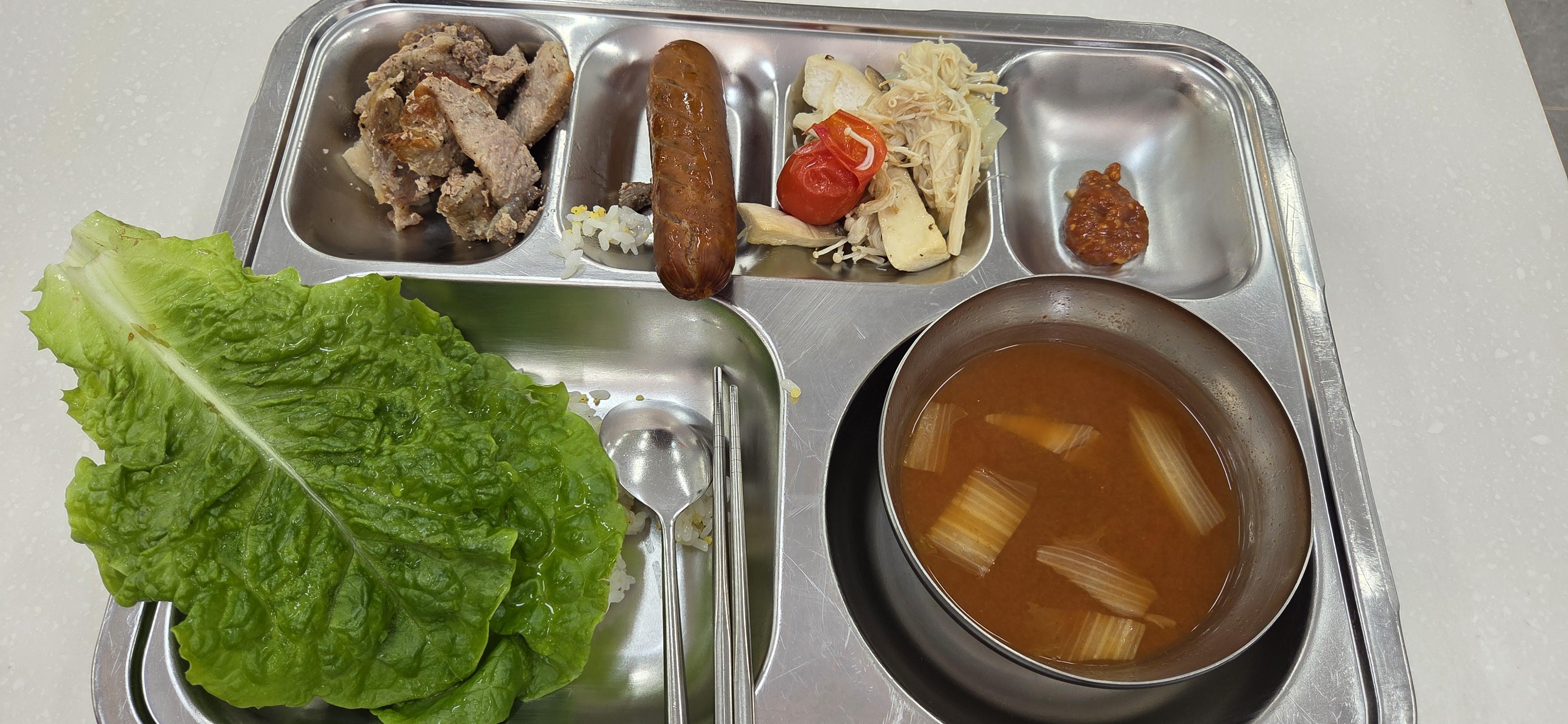 Our school cafeteria is run by a nutritionist and multiple cooks who make the food for over 600 people every day. They also make dinner for the students who stay after school to study more. When you walk into the cafeteria, you get in line to grab a tray, chopsticks and a spoon. Then, you walk over to the giant bowls of cooked rice, where you can serve yourself as much rice as you want. After you get your rice, you line up in front of the kitchen, where the cooks serve you the main parts of the meal and your soup. In South Korea, rice, soup and kimchi are the staples of the meal. Finally, there is another self-serve station where you can grab kimchi, salad, and the treat for the day. They usually have some sort of drink or small dessert with the meal.
