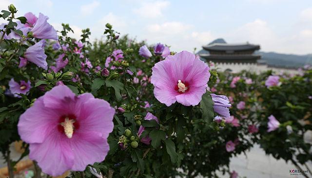The national flower of Korea is the Hibiscus syriacus, more commonly known as the Rose of Sharon. This flower is even mentioned in the Korean national anthem. The flower's Korean name is mugunghwa (무궁화). The flower's symbolic significance stems from the Korean word mugung, which means "eternity" or "inexhaustible abundance".