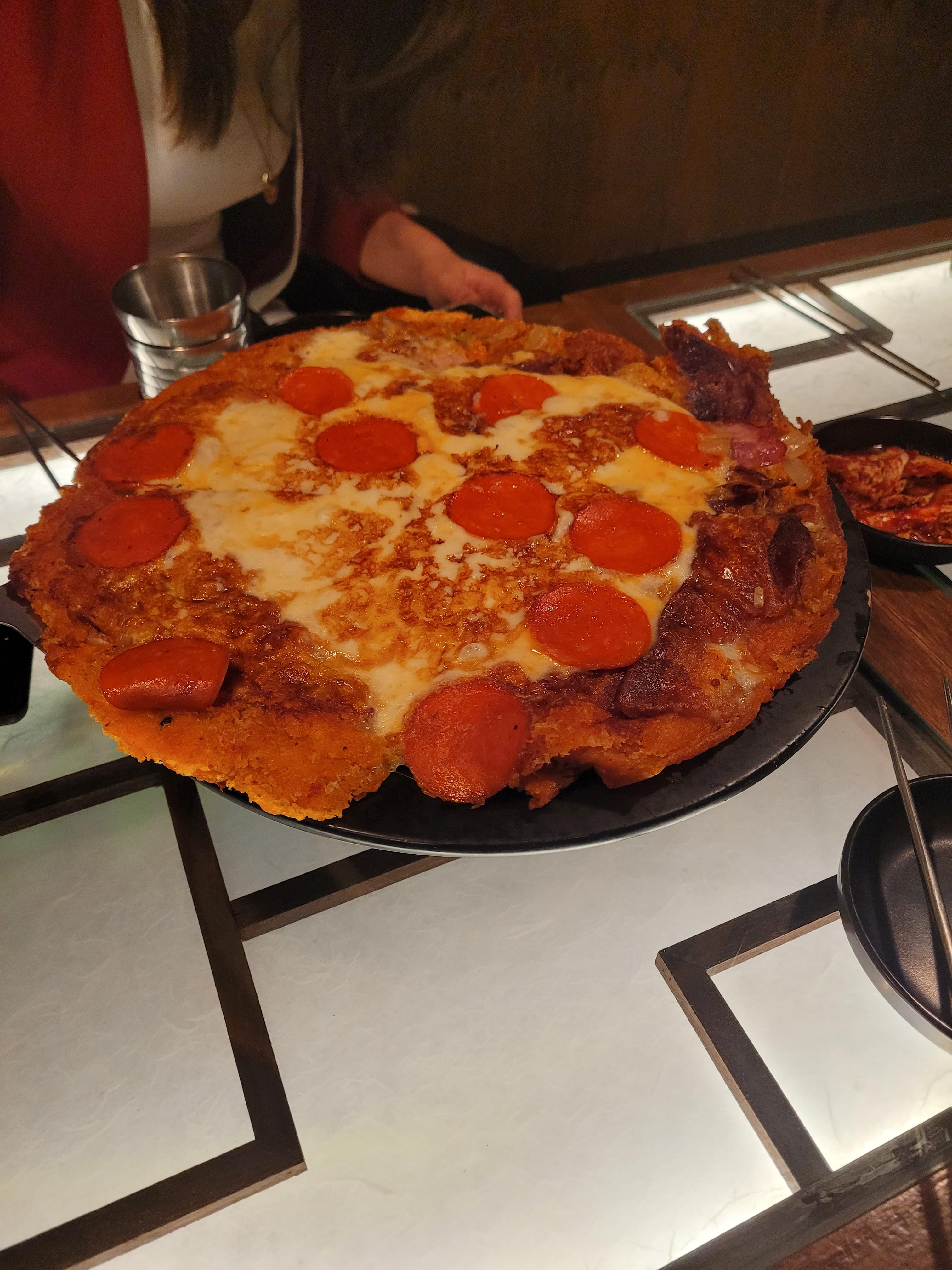It felt like playing with my food, but it’s actually a totally normal and fun way to eat here. I also made sure to try kimchi jeon, a savory pancake that looks exactly like a pepperoni pizza but tastes spicy and tangy.