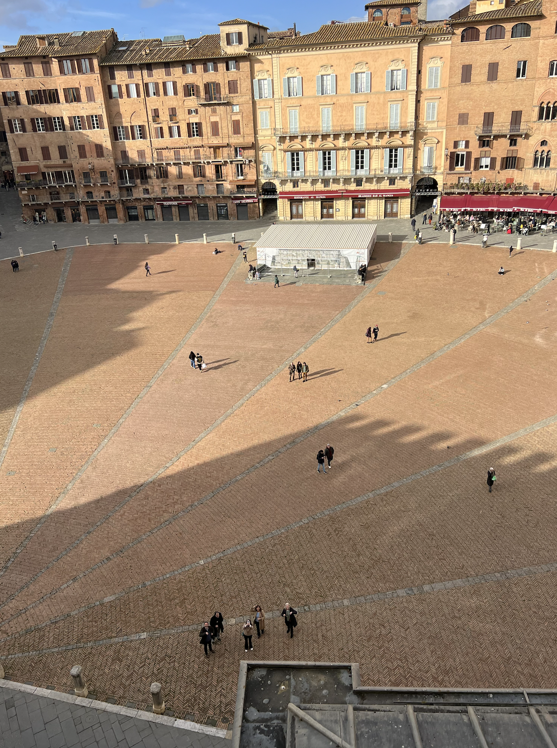 One cool thing about rain here in Siena is the view from the piazza (the main square). The piazza is slanted downwards with a drain at the very bottom. If you’re able to power through the rain to get to the main square, it’s quite beautiful to watch the rain trickle down the slope like a race to get to the finish line. The sound of the water is also very calming since the rain not only hits the stone streets, but also the fabric of the awnings that hang over the restaurants around the square. There’s also a little fountain in the middle of the piazza. The sound of the rain, therefore, comes in many different forms and creates a really beautiful harmony for those that are willing to listen.