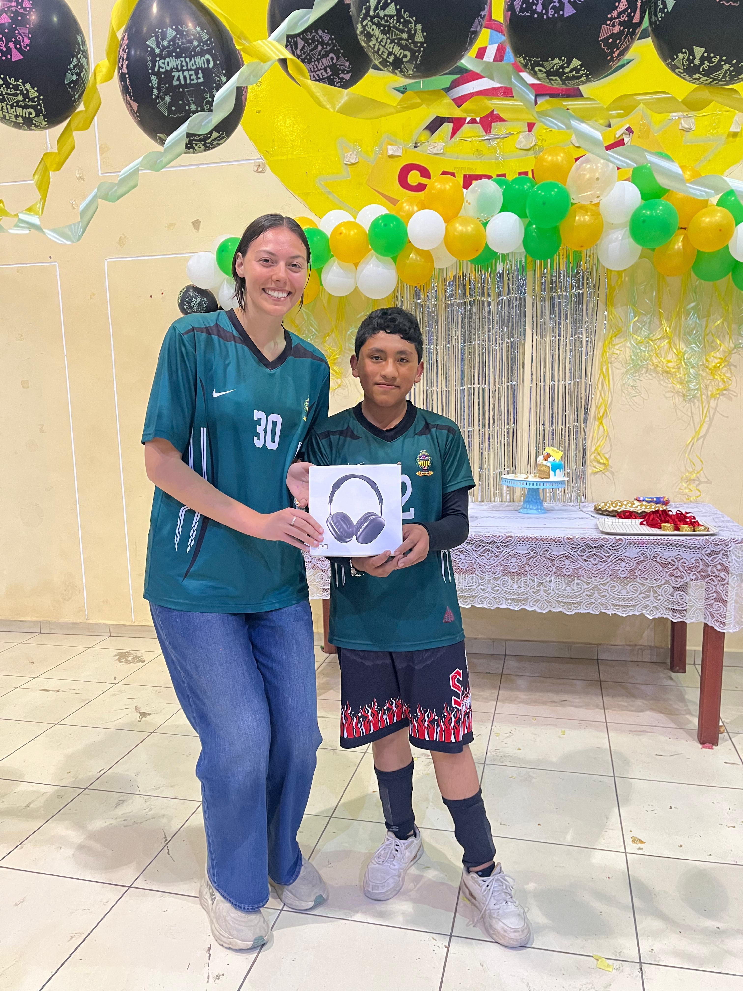 Hicimos una despedida para los equipos de voleibol estudiantiles para terminar el año de entrenamiento. Yo pinté las caras de los estudiantes y compartimos tortas. Decoramos con bastantes globos. Los estudiantes jugaron sus últimos partidos de voleibol del año y después hubo una danza criolla del Perú con bailarinas. Tuvimos música toda la noche. Y al fin de la noche, hicimos una ceremonia para dar las medallas a cada estudiante, una donación de los padres de familia.