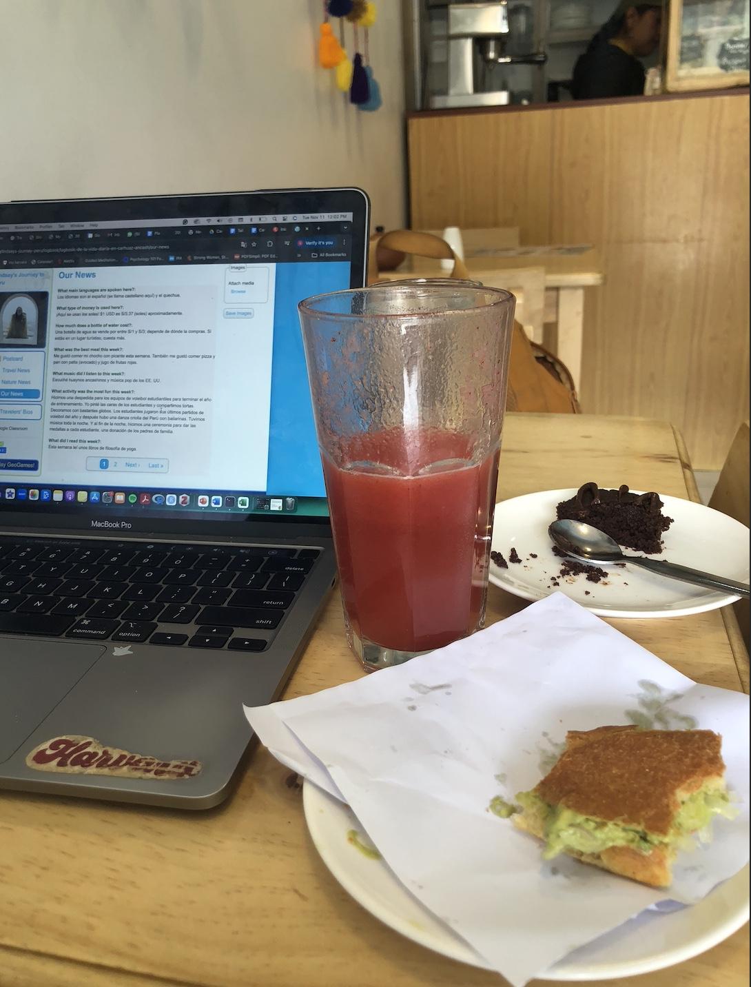 Me gustó comer mi chocho con picante esta semana. También me gustó comer pizza y pan con palta (avocado) y jugo de frutas rojas.