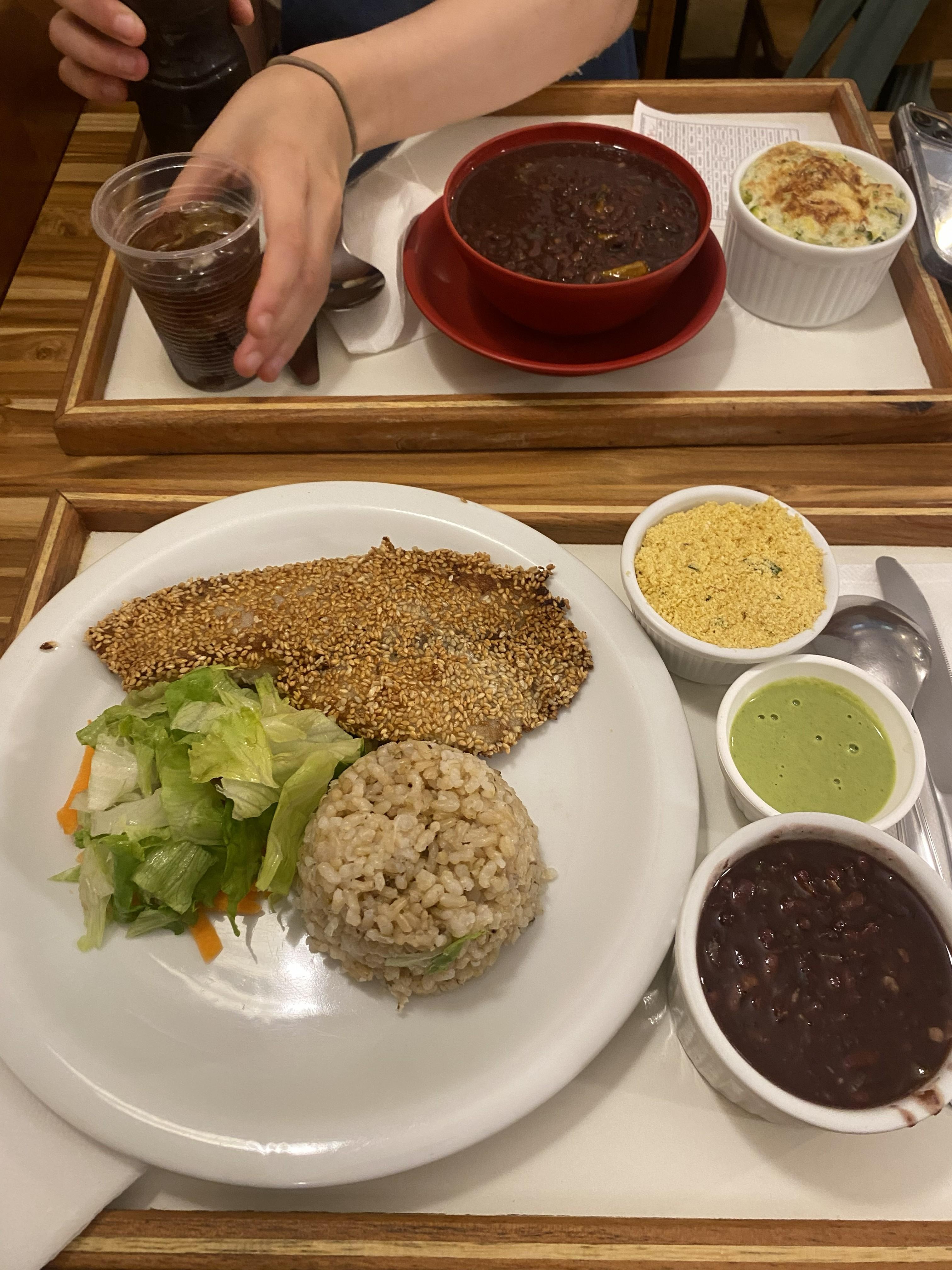 Farofa is toasted cassava flour, often seasoned with butter, bacon, eggs, etc. The seasoning varies, but it adds a unique crunchy texture and savory flavor to the dish it accompanies. Farofa is often a key component of a prato freito, along with rice, a protein like grilled chicken, some vegetables, and feijão. Feijão is an essential side dish in Brazilian cuisine, and is a thick, slow cooked soup seasoned with garlic, cilantro, bay leaves, and often sausage or bacon.