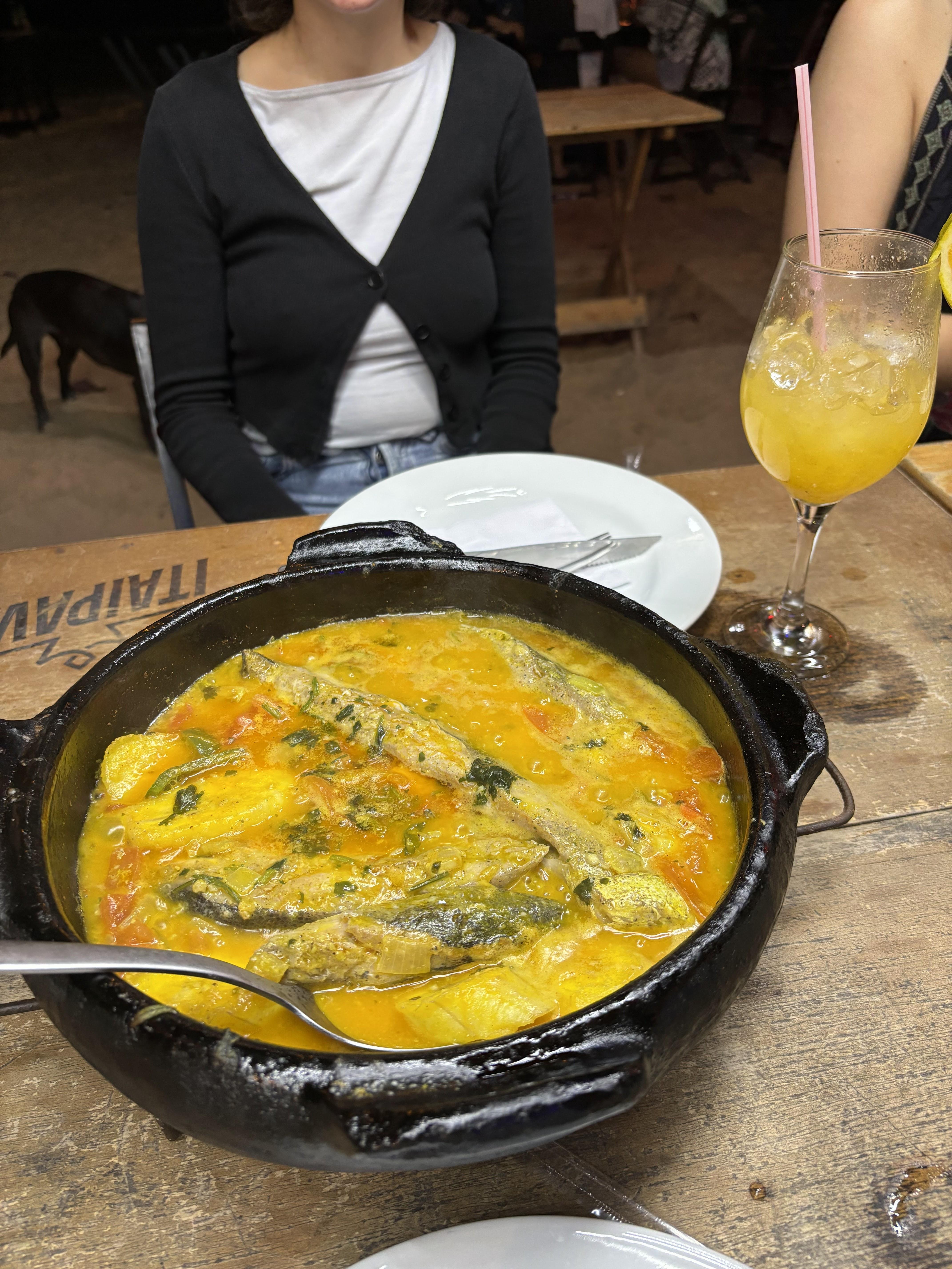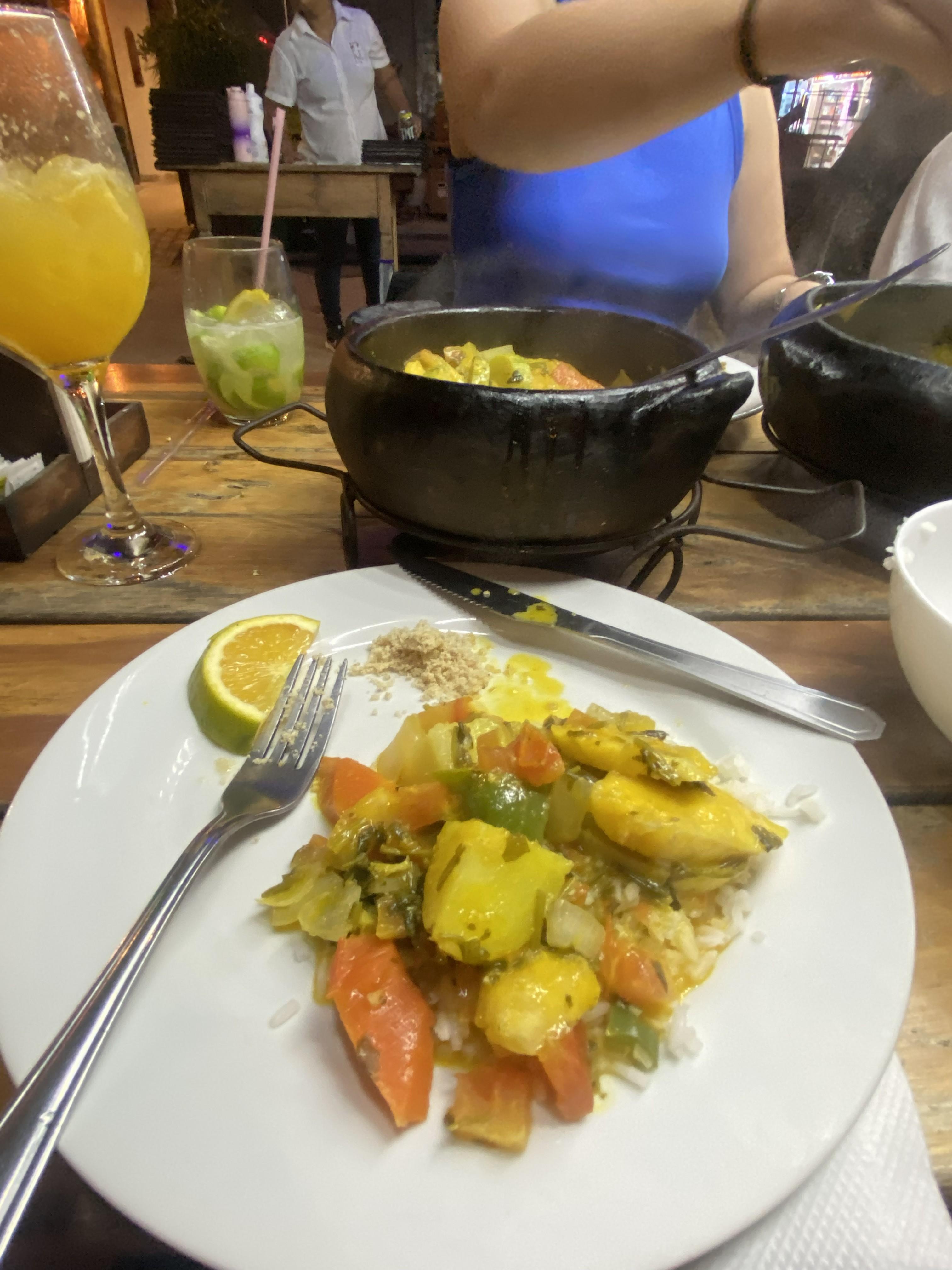 Moqueca is typically cooked in a clay or cast iron pot, and seasoned with garlic, onions, tomatoes, and other spices. It is generally served in a hot bowl, and is best enjoyed when shared since serving sizes require at a minimum two people.
