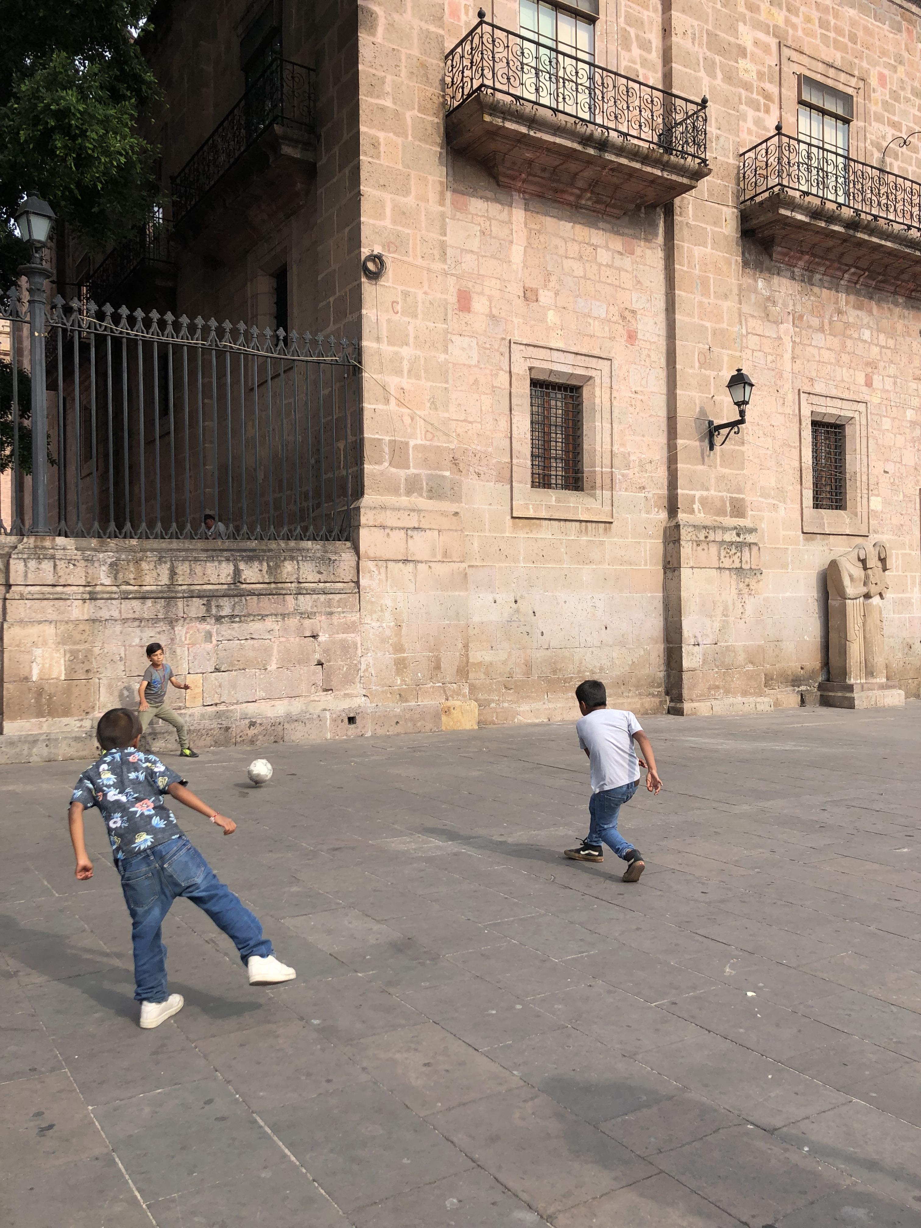 People like to gather in plazas and parks to play a round or two of soccer. I often see groups of kids or adults playing soccer when I walk around the city.Just this afternoon, I went on a walk in downtown Morelia, a city in the state of Michoacán. We visited the beautiful cathedral, and just outside, there were three boys playing soccer.