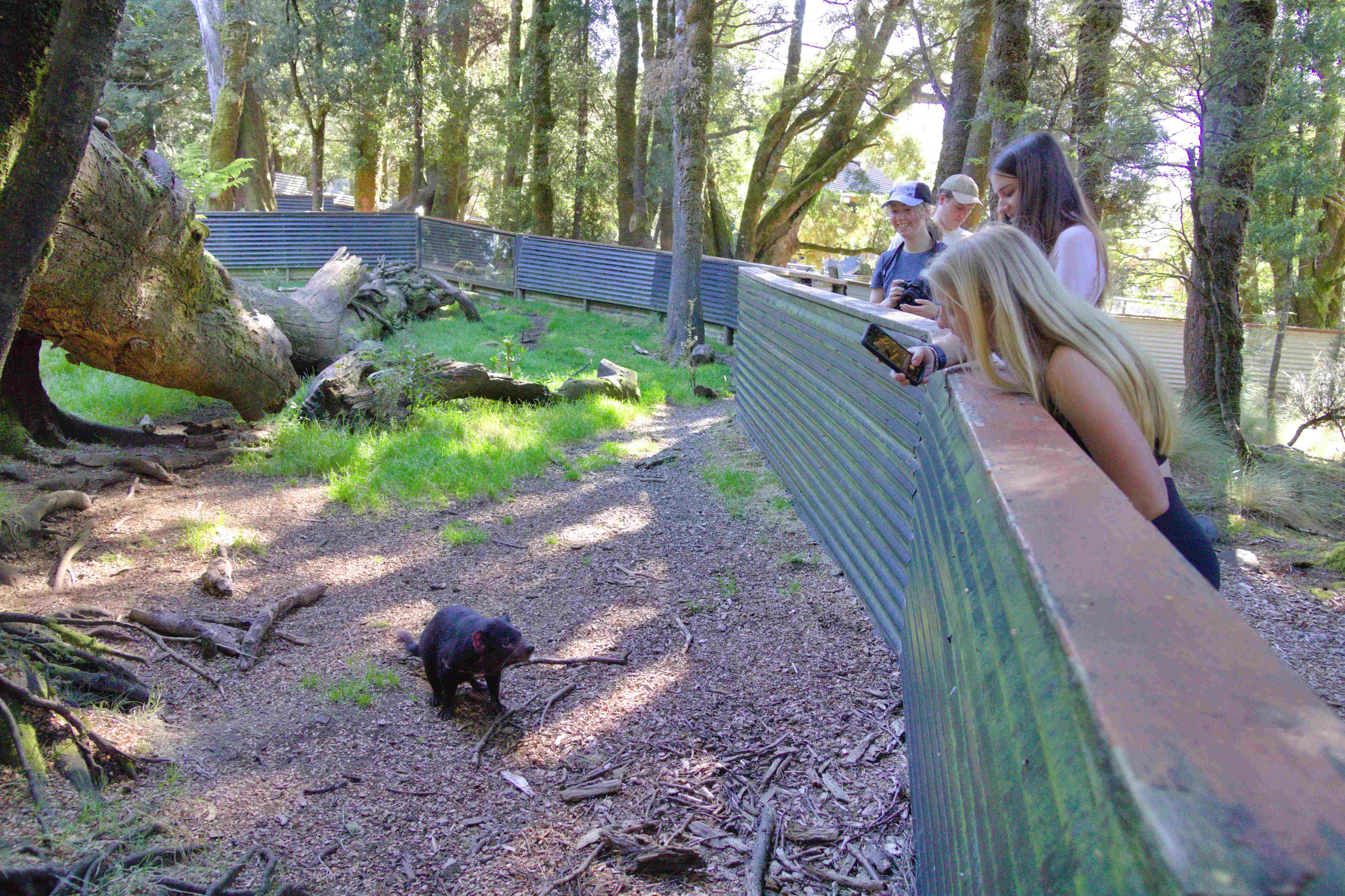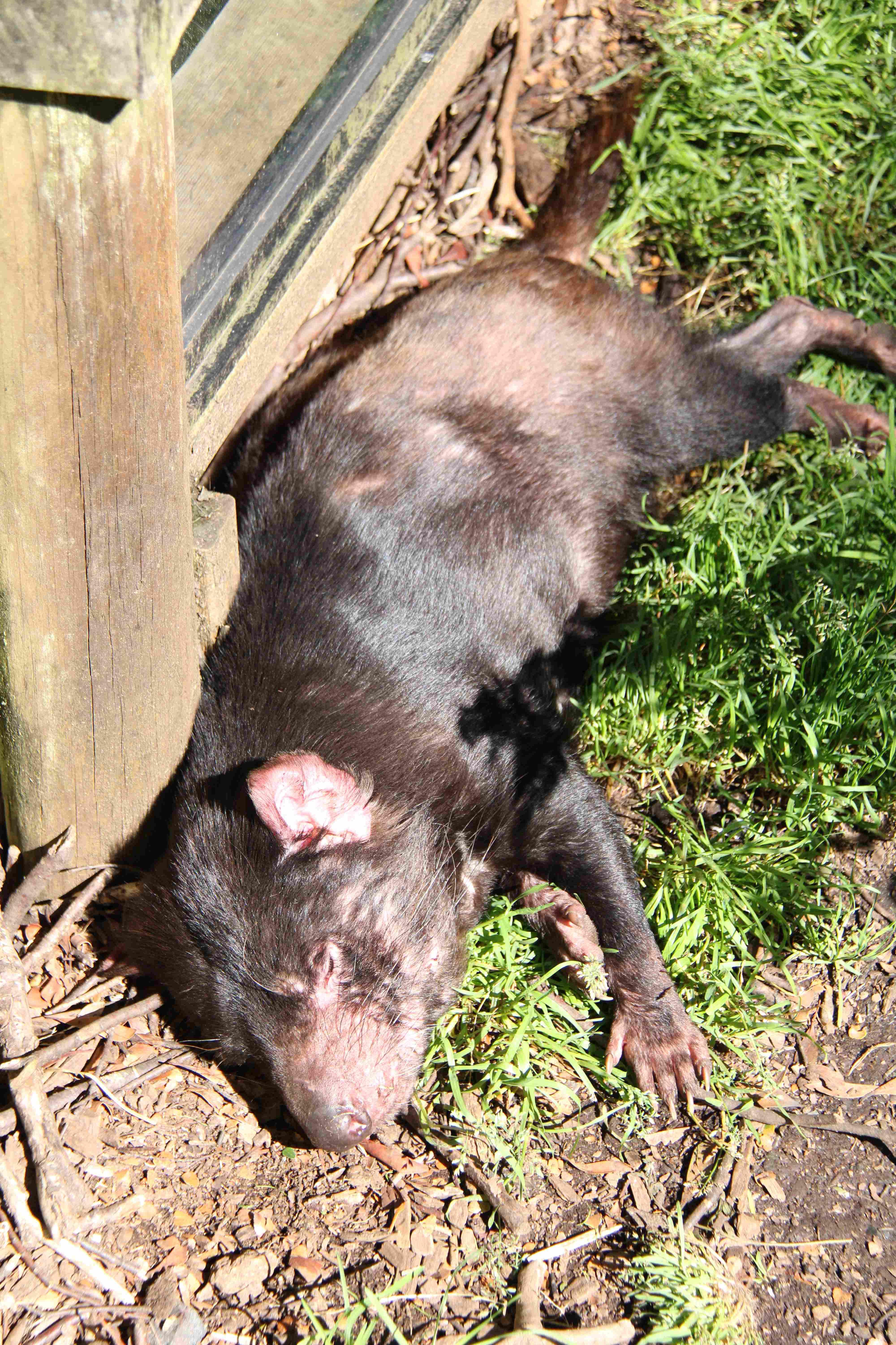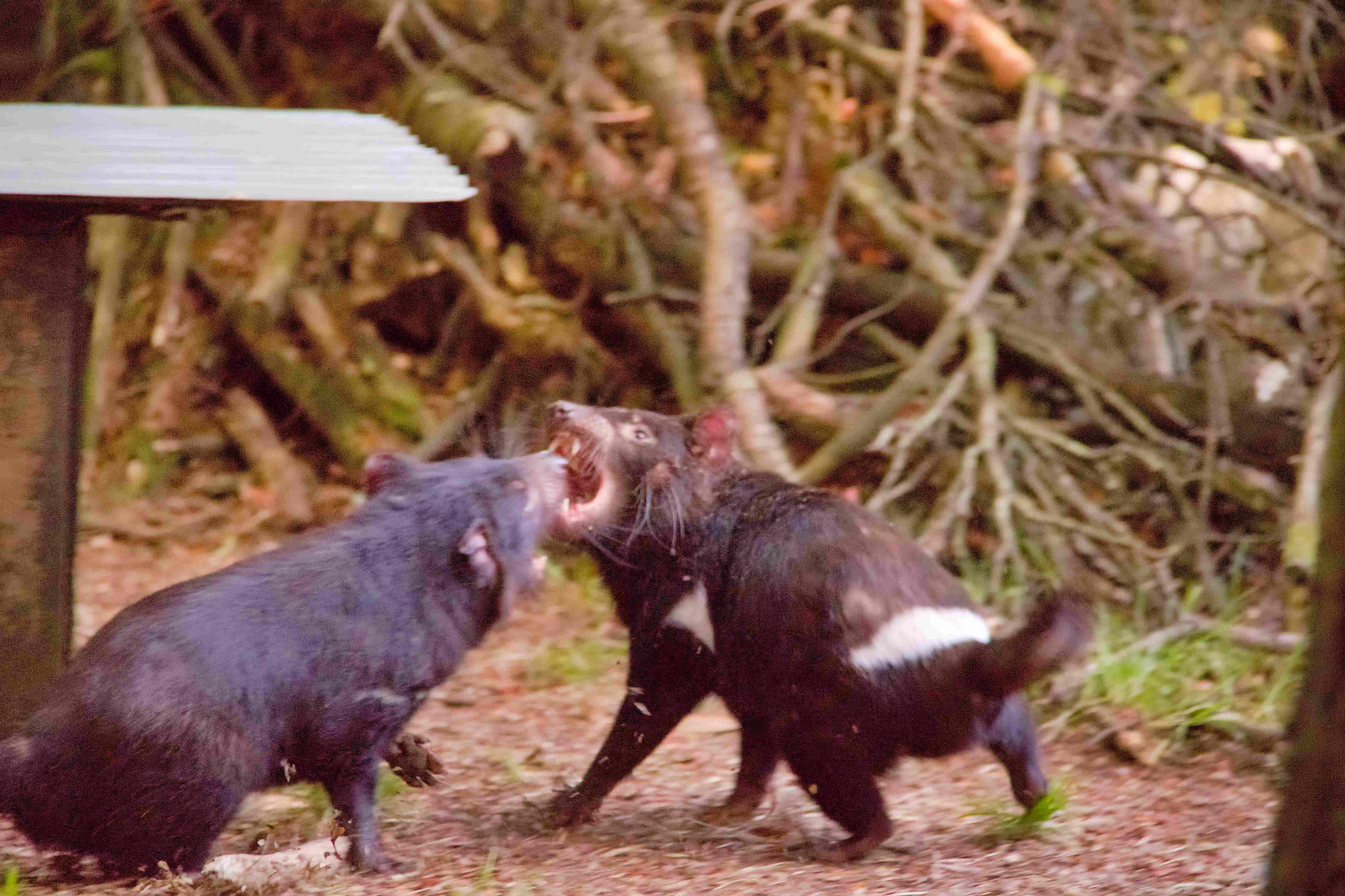 Upon entering the reserve, the first enclosure we saw was filled with juvenile devils. These devils had all black coats and were about the size of a large house cat. Some were chasing each other throughout the enclosure, and others were basking in the sunlight. Nearby were several enclosures with adult devils. The adults had more white spots across their chests, and were about 25% larger than the juveniles we saw. The adults were also more temperamental. We witnessed several tussles when one devil would get too close to another. During these altercations, the devils would bear a set of very sharp and intimidating teeth and make loud shrieking and grunting sounds, not unlike the beloved cartoon character.