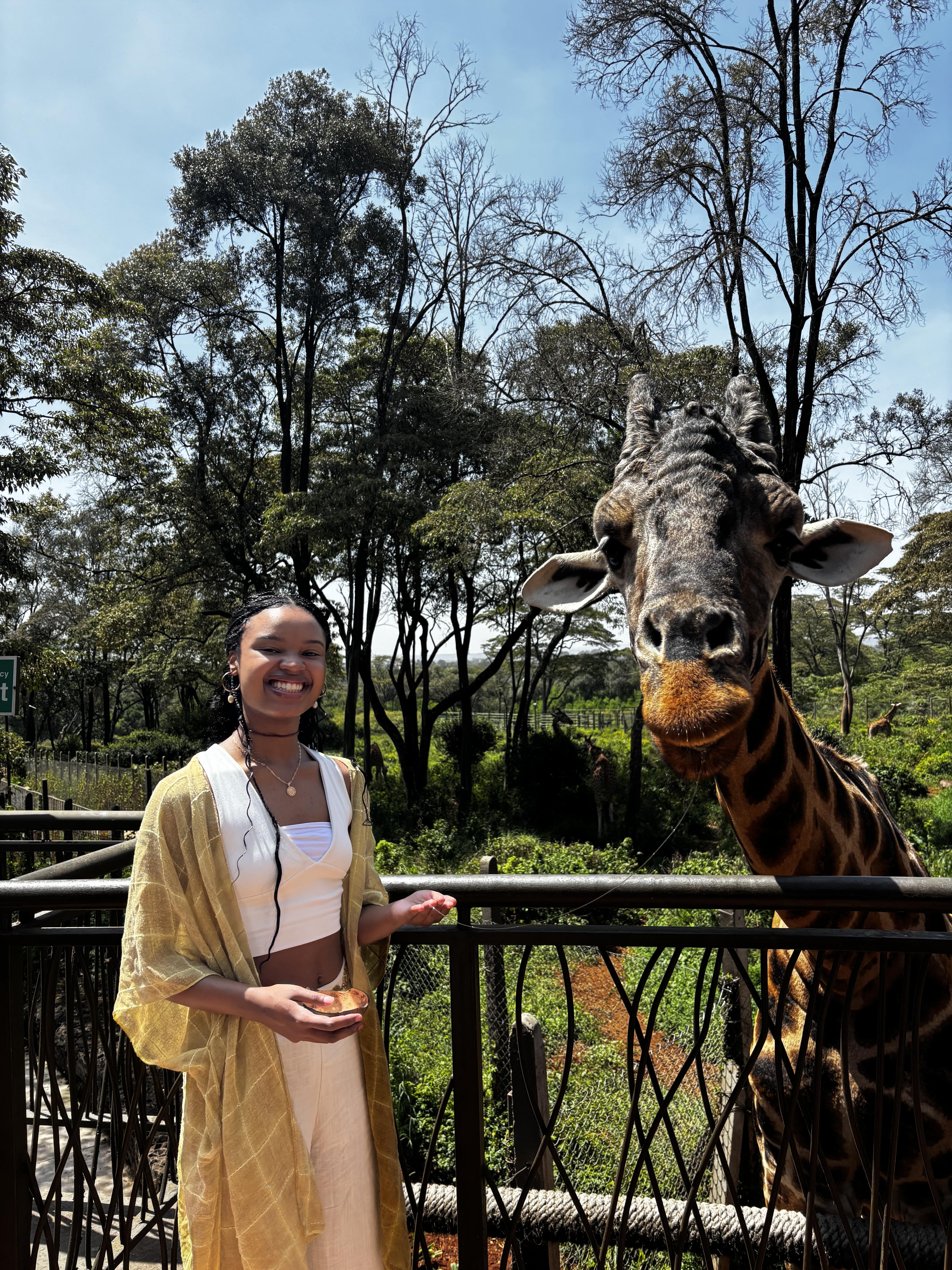 I got to feed a giraffe in Kenya. At first I was nervous! But the giraffe was very gentle and friendly. It ate food from my hand with its long tongue. It felt warm and a little slimy!