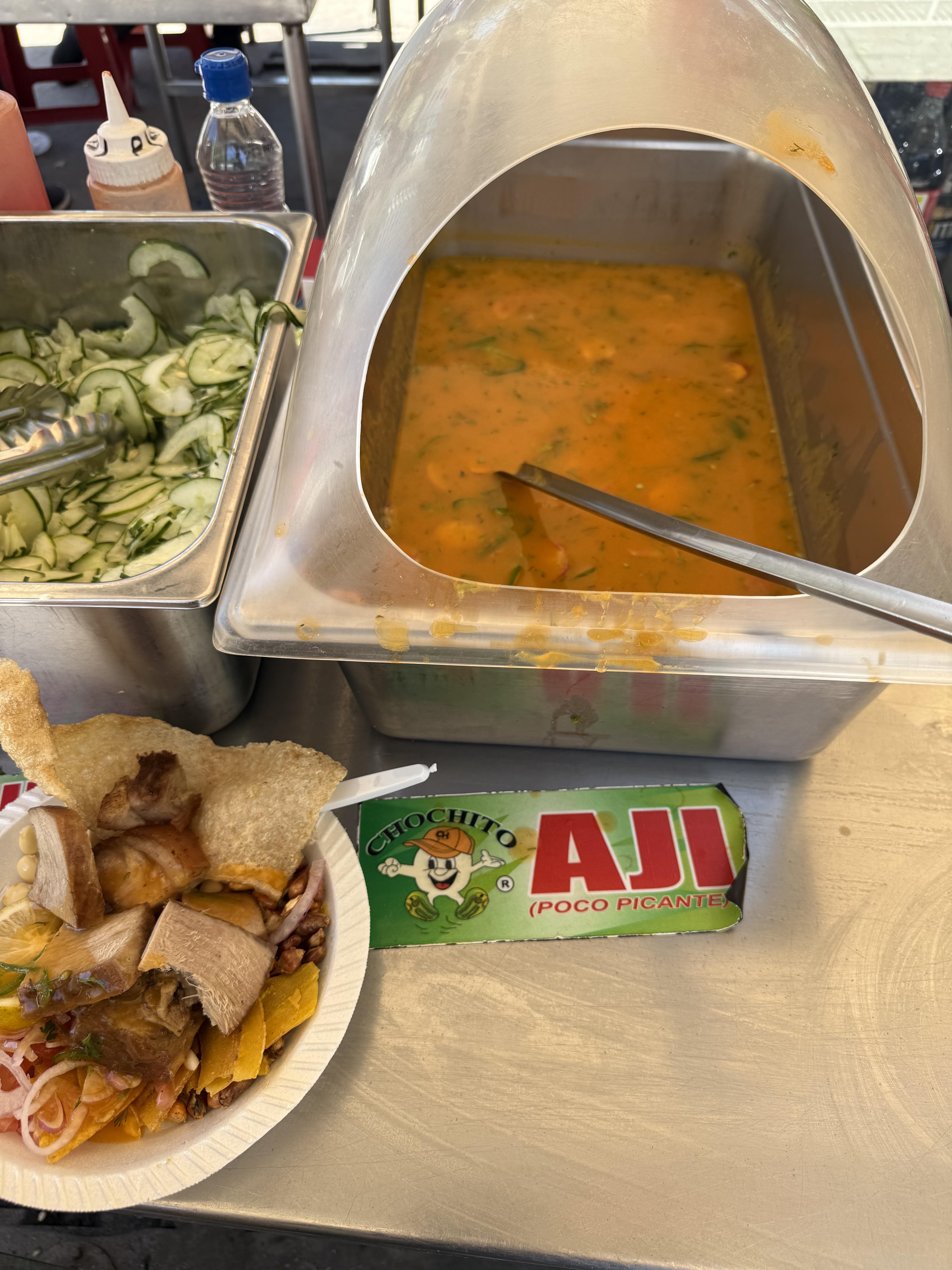 At first, I felt a little apprehensive. There were so many different flavors and textures that I thought I might get overwhelmed. Plus, I was worried I'd add sauces that I'd end up disliking and thus ruin the whole experience. When I was your age, I was a pretty picky eater, and sometimes trying unfamilar foods is still challenging. That's one of the reasons I chose to try cevichochos, to push myself. I'm so glad I did. Cevichochos are now one of my favorite foods! I ended up adding ají sauce, lime and extra cilantro to my bowl. I didn't want to add too many extra flavors because I was really focused on trying to taste the individual ingredients, but I just couldn't pass up the opportunity to include ají. Ají (pronounced ah-hee) is a very common hot sauce here. It's not always spicy, though. The base is hot peppers, but it can also include onion, cilantro and even fruit juice.