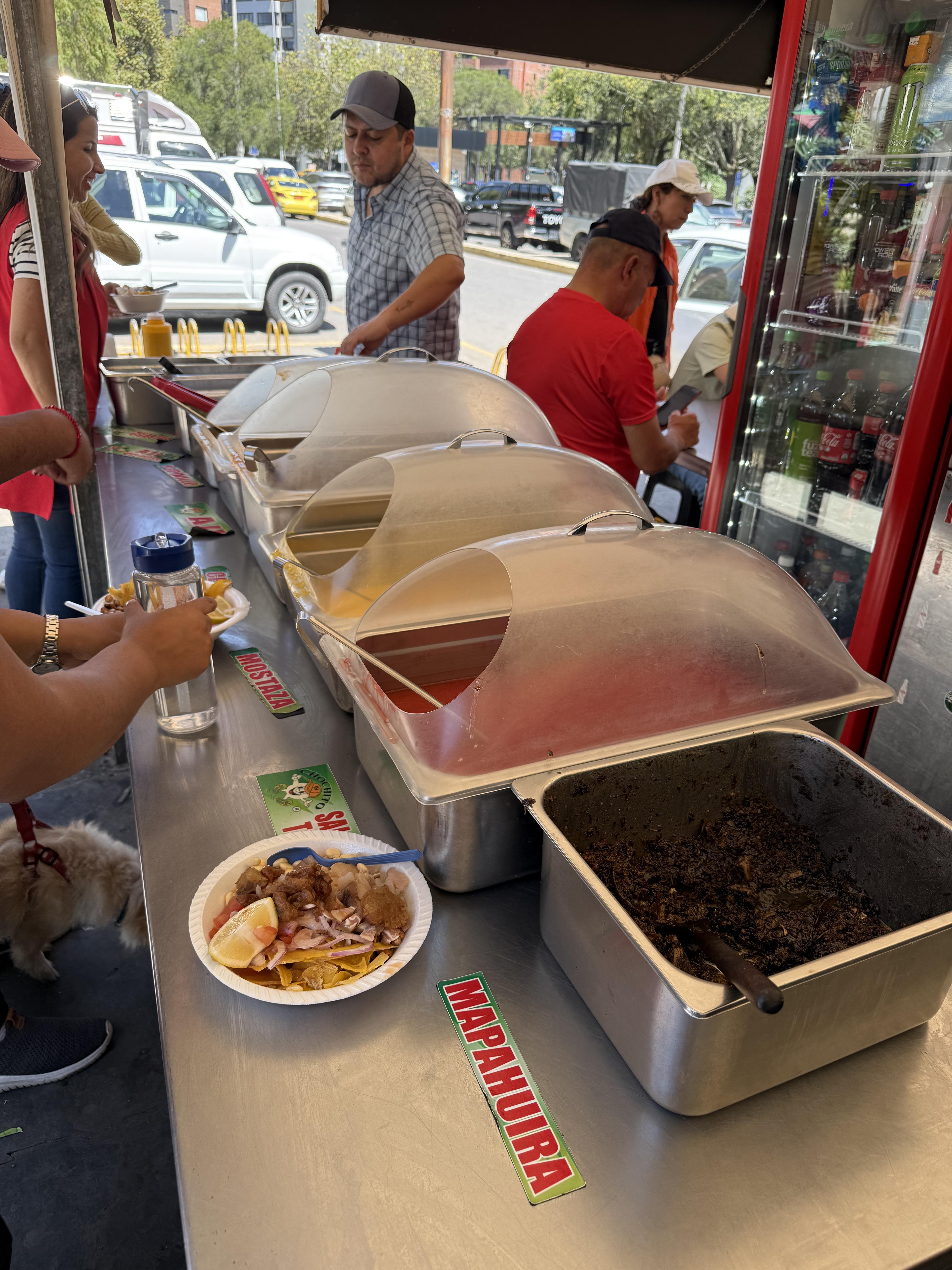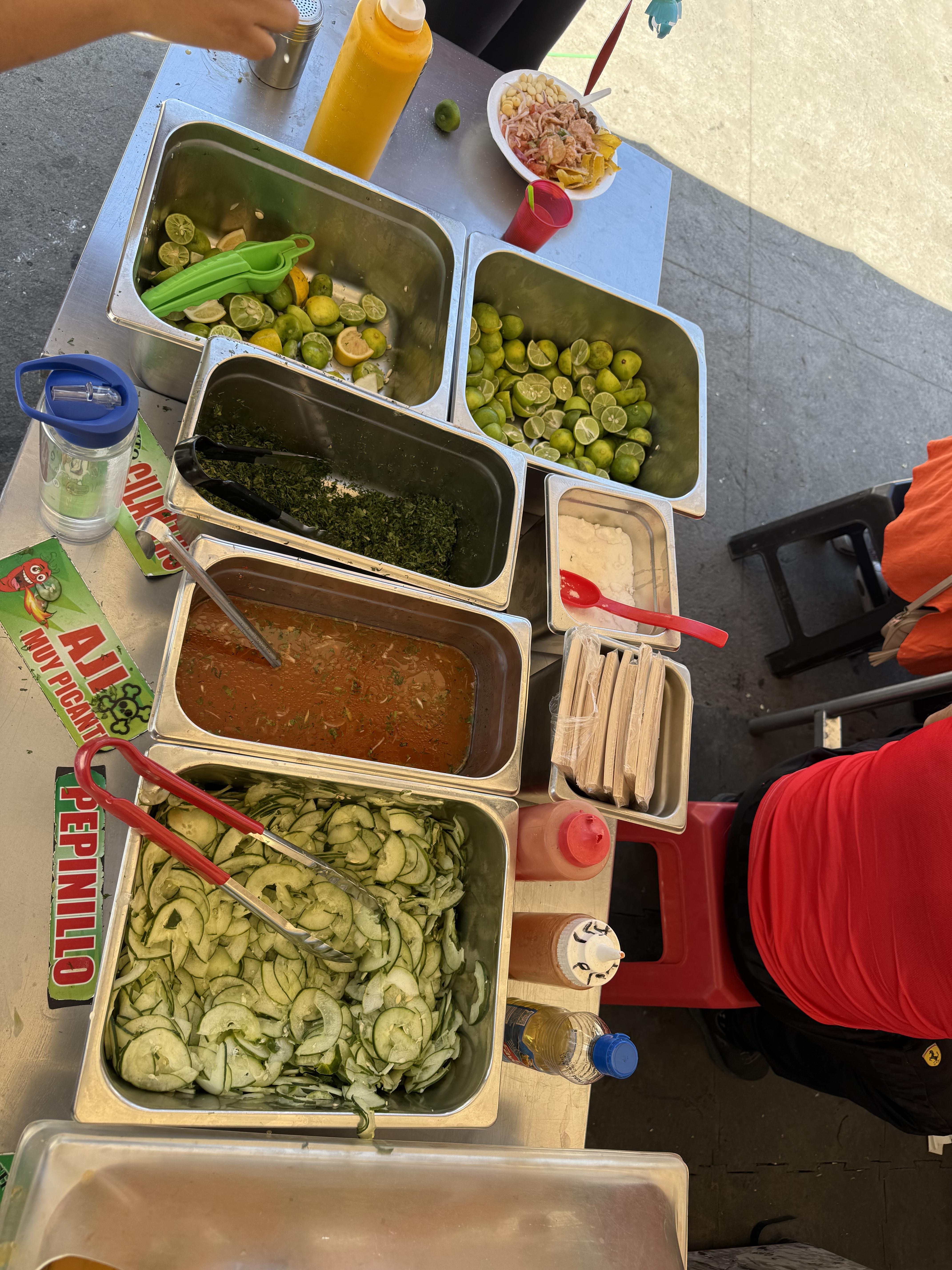 A little boy that I interviewed told me that maduro (plaintain) are his favorite part of the meal, so I gave him my maduro as a thanks for his help. He showed me how to customize my cevichochos even further by directing me to a table bulging under the weight of many, many delicious sauces and toppings. You might remember from our video call that I told your class that there are sauces everywhere here in Ecuador. There were at least six available at this business!