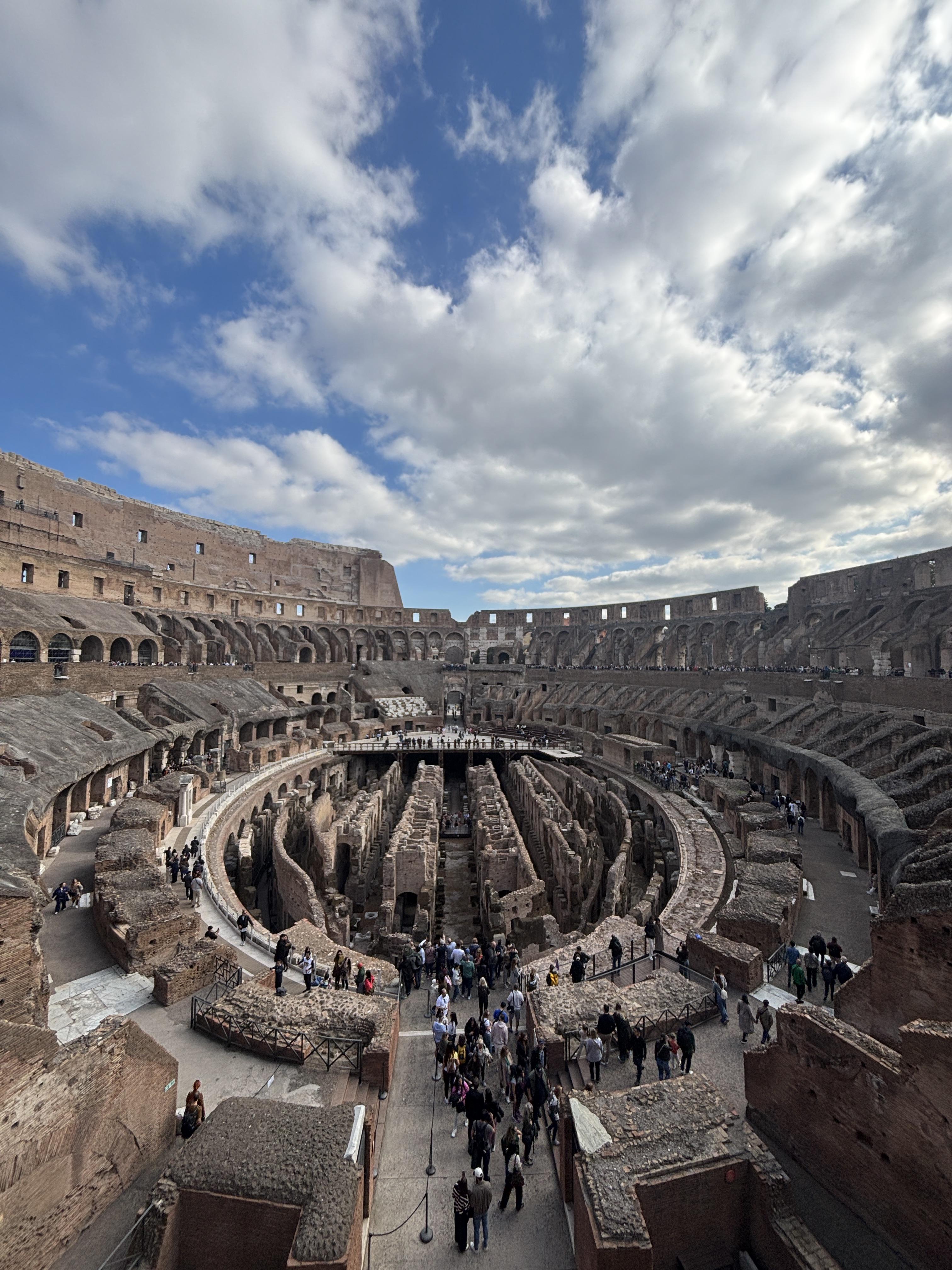 Inside of the Colosseum, this area is called the arena, where gladiatorial combats and other events took place. All of the tunnels below the arena are where they used to keep enslaved persons, fighters and animals before they entered the arena