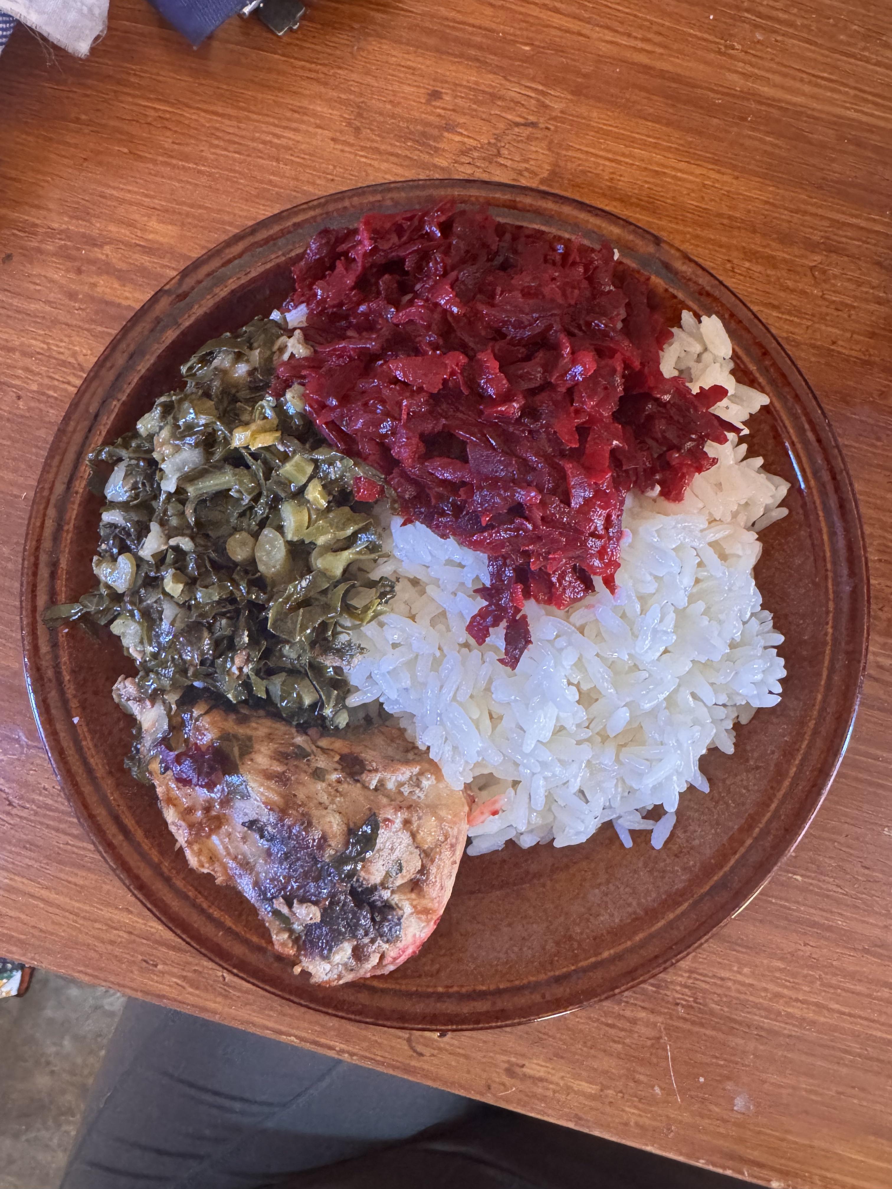 For breakfast, I usually eat warm porridge. At lunch, I have samp (corn cooked with beans). For dinner, we often eat chicken with rice and beetroot, which is my favorite part of the meal.