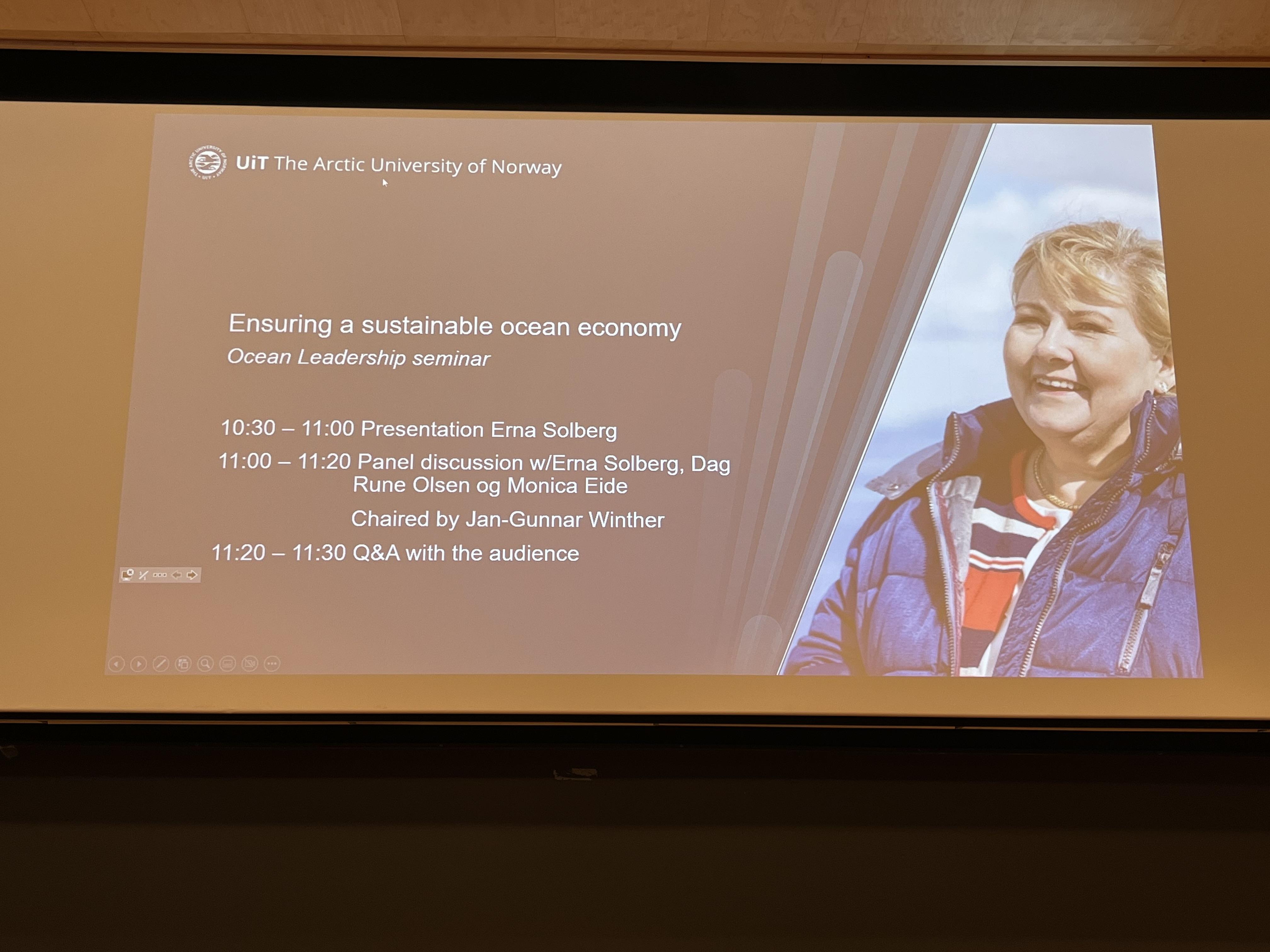 Most people dread Mondays. I can relate to the feeling. I know it was even harder when I woke up at 6 a.m. for high school, so hang in there. However, yesterday, a Sunday, I was already itching for it to be the next day! At the start of this week, I had the privilege of listening to the former Prime Minister of Norway, Erna Solberg, speak on ocean security and the hopes and necessary actions needed for a sustainable ocean economy of the future. She came here to Tromsø to speak at our university for a talk hosted by our school's Ocean Leadership Master's Program & the Centre for the Ocean and the Arctic. Erna Solberg is not the first but the second female prime minister in Norway's history. It was a pleasure to listen to a powerful woman in global politics who has humanistic points of view regarding education and the environment.
