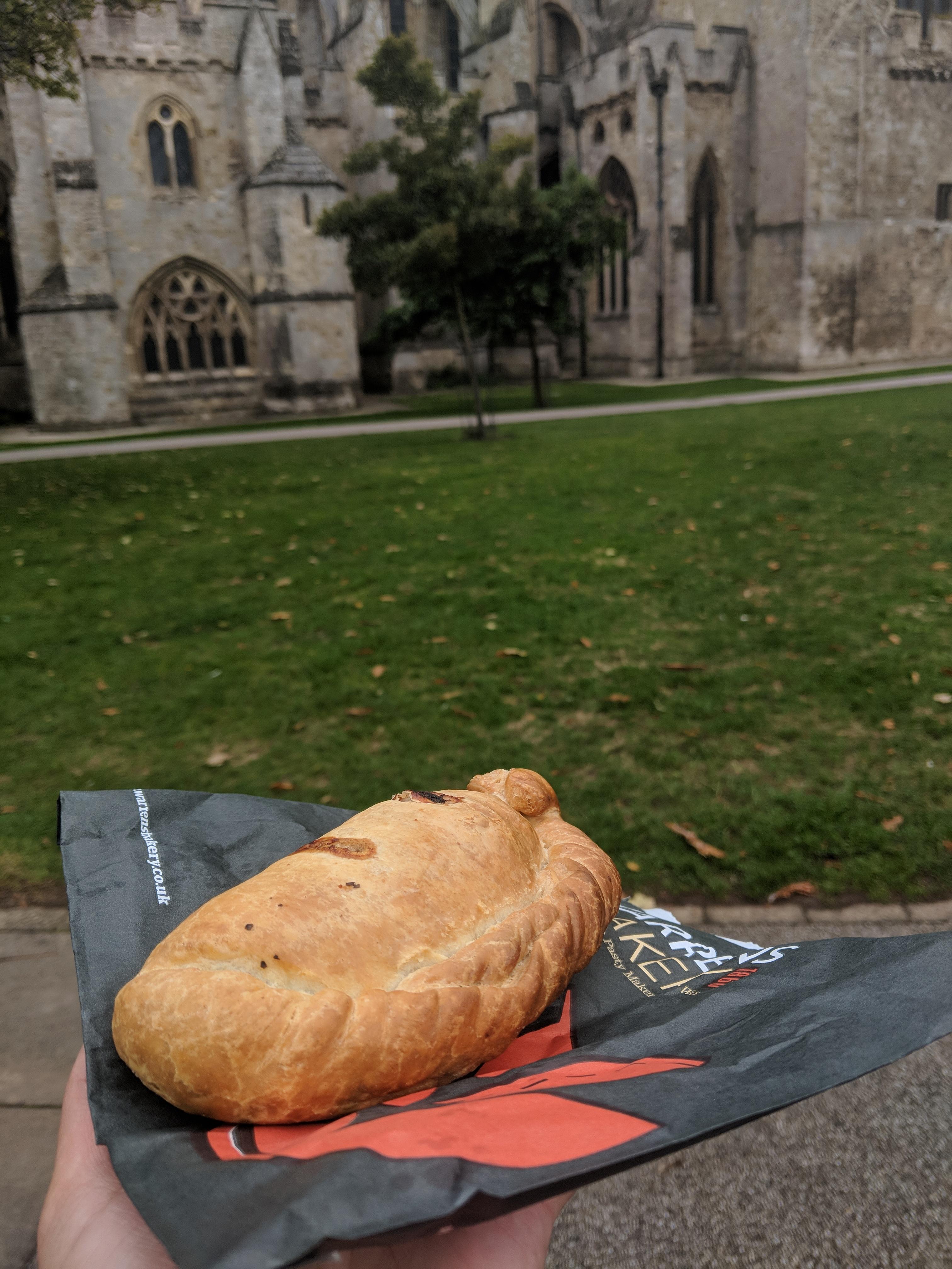 I bought the pasties then went to eat them in front of Exeter Cathedral. It was a cold day, so the pasties did a good job of warming me up. They tasted good, and I was surprised how much the chicken pasty resembled the chicken pot pies I have had in America. These pasties cost about 2.50 pounds each, which is a good price considering each pasty can act as a full meal.