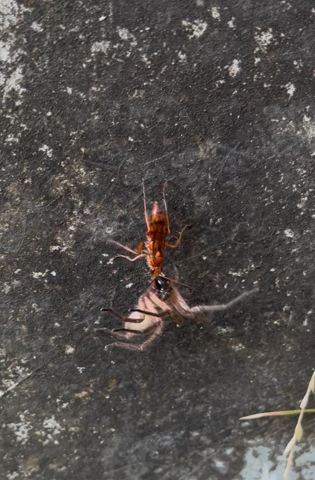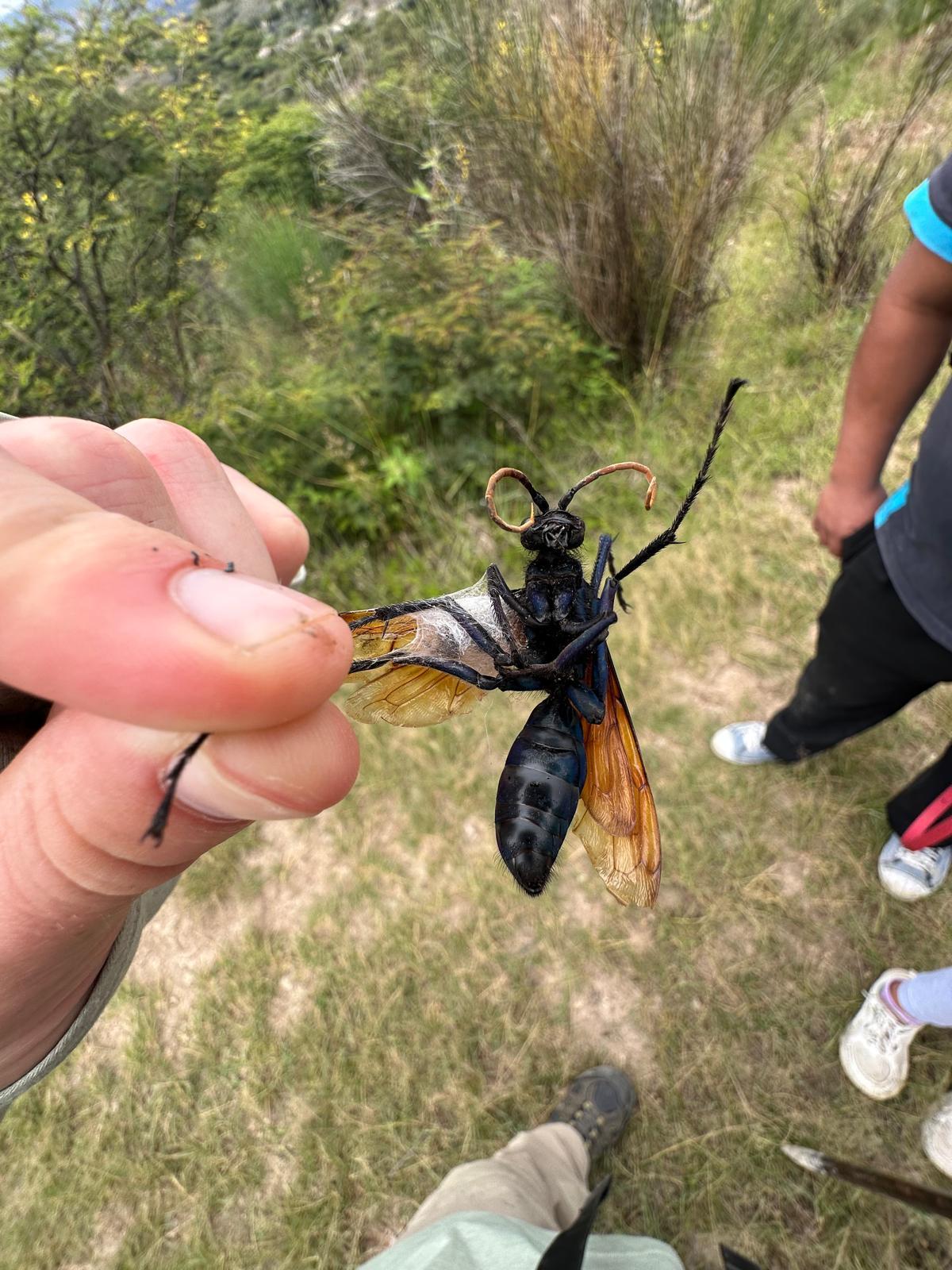 This is a tarantula hawk. If you remember, I showed you all a video of it during our live video call! It looks like a big wasp, and it is usually black and red/orange. It has six legs and flies! They are about one inch long here in Peru, but can get up to two and a half inches long!