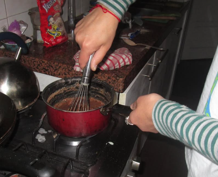 Brigadeiros are actually very easy to make! First, we mixed sweetened condensed milk, chocolate powder and butter in a pot. We cooked everything on the stove, stirring the whole time so the chocolate wouldn't burn. After a few minutes, the mixture became thick and shiny. We let it cool down, and then we used our hands to roll small pieces into balls and covered them in chocolate sprinkles for decoration.