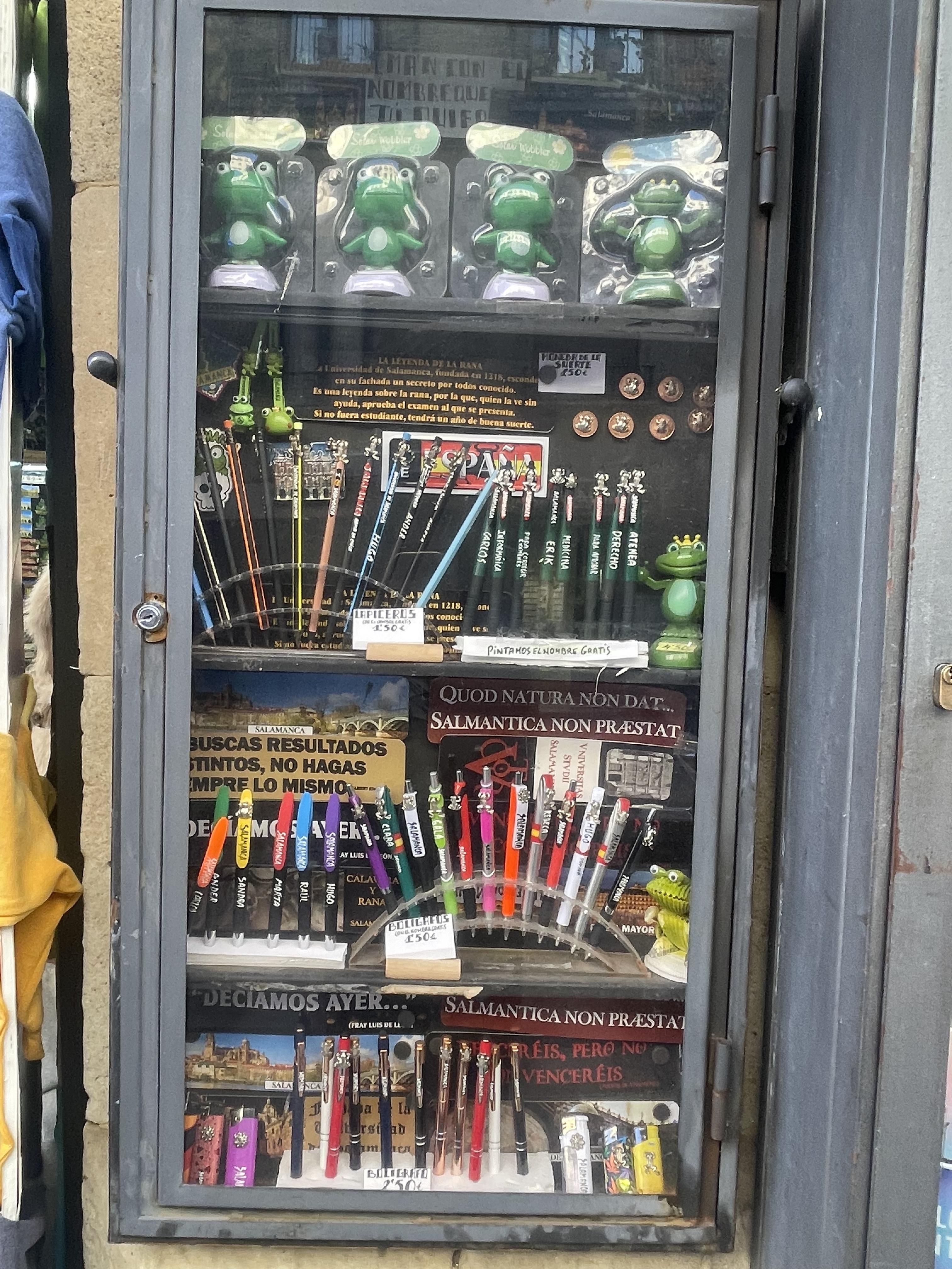 When I first saw the stuffed animal version of the frogs in Salamanca, I felt really happy, if a little surprised: I just wasn't expecting to see so many different kinds of frogs everywhere, here! I love stuffed animals, so seeing the frogs in different colors, sizes and styles definitely made me happy. The city of Salamanca started feeling more comforting and less scary to me because of its love of frogs!