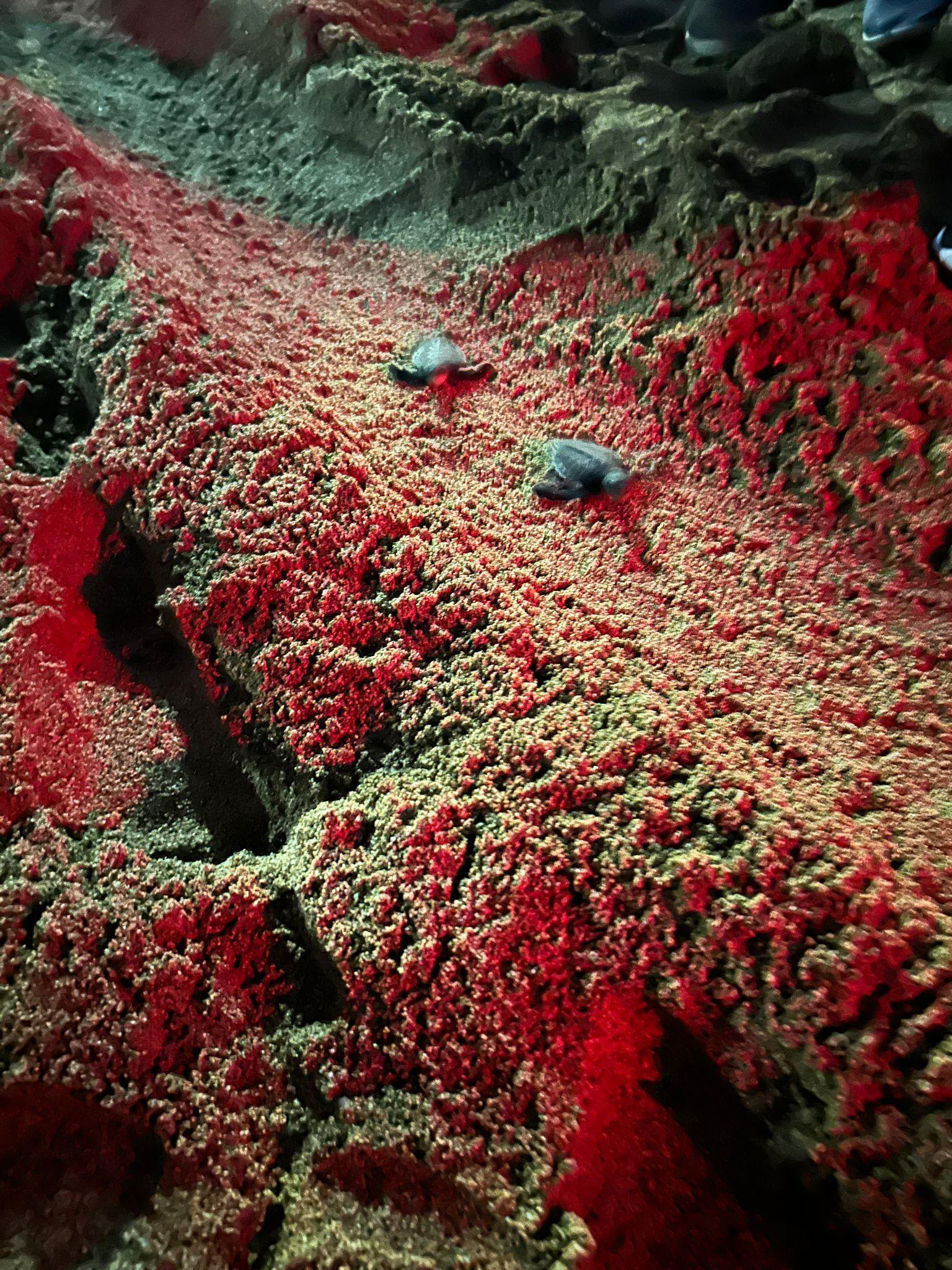 The baby turtles using a red light to find their way to the ocean/Las tortugas bebés utilizan una luz roja para encontrar el camino hacia el océano