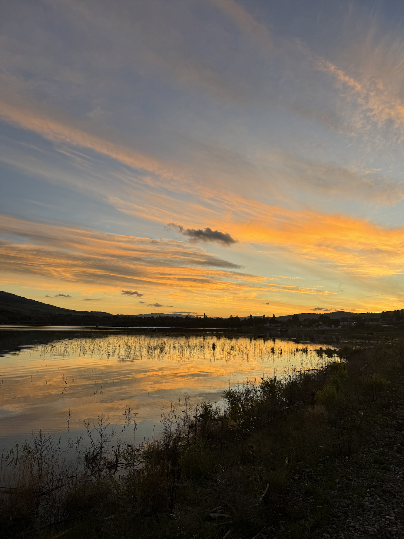 It was an incredible sunset after a few days of clouds and rain. The sky looked like a painting filled with orange and pink colors, and you could see its reflection in the lake!